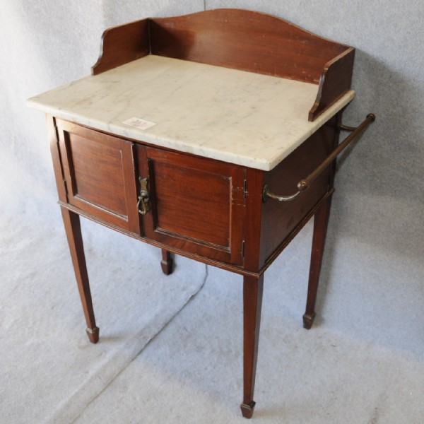 A small Edwardian mahogany marble topped washstand with shaped gallery back, two doors with recessed panels and brass towel rail, raised on tapered legs. Size: 91 high x 65 wide x 45cm deep.