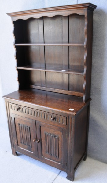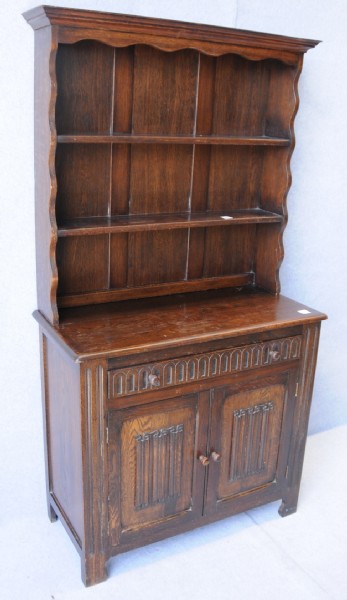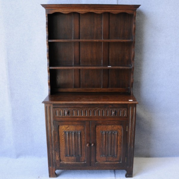 A mid 20th century oak dresser with plate rack with a moulded cornice. The bottom having a single drawer over two doors with linen fold panels.