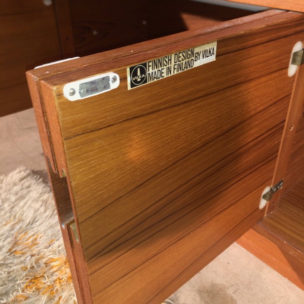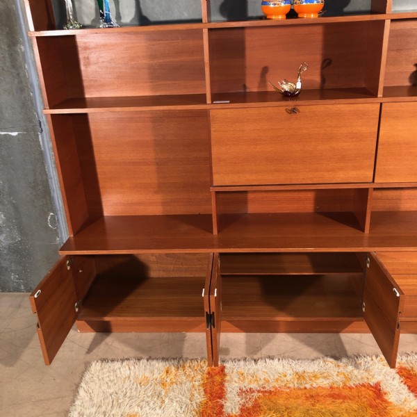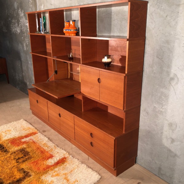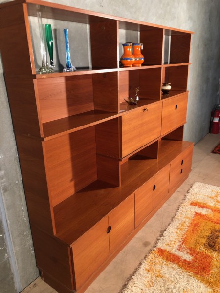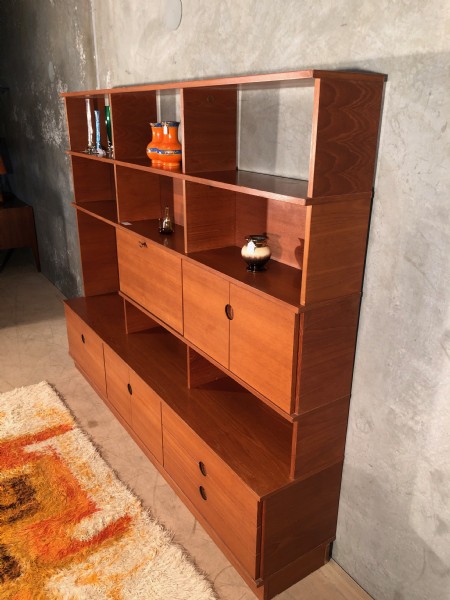 A Mid Century Finnish Vilka teak wall unit with drop down cocktail servery, series of open bookcase/display shelves and doors that enclose internal shelving and a bank of 3 drawers including a cutlery drawer the cocktail interior is awiting its replacement back mirror. Depth of top shelving is 270mm