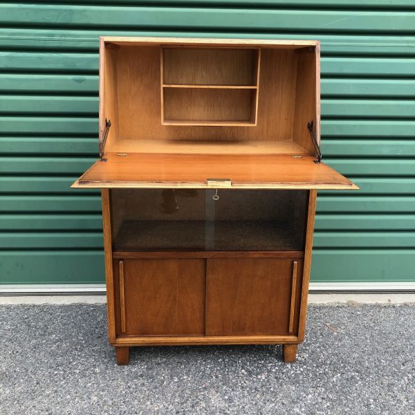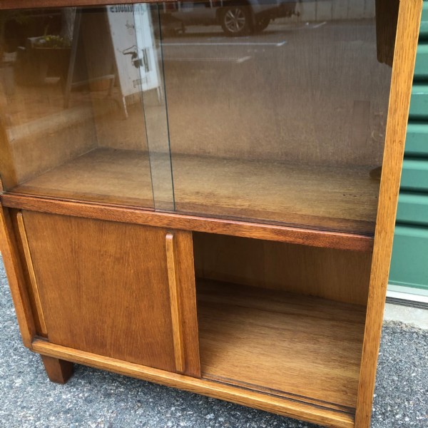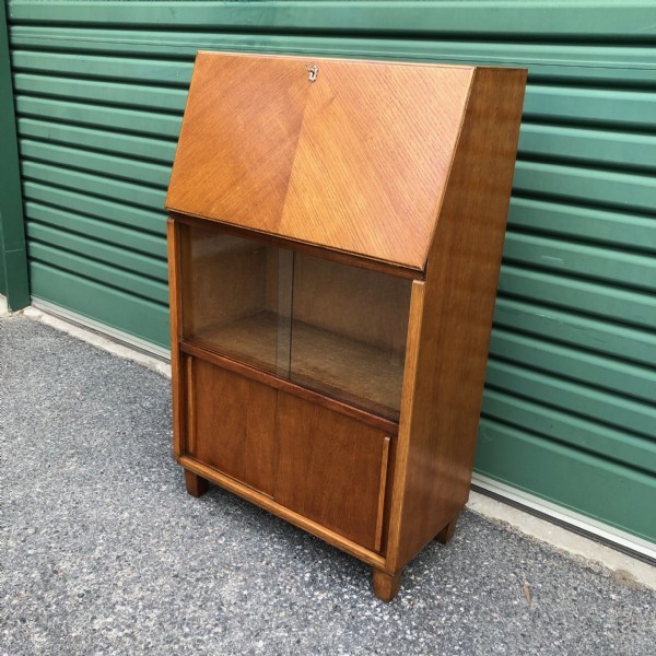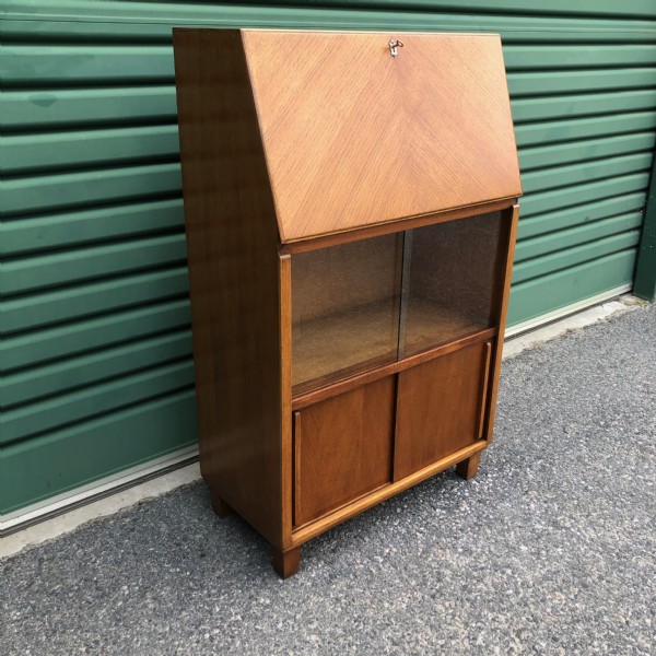 A Mid Century oak bureau bookcase with drop down lockable writing flap that enclose internal pigeon holes, below there are two sliding glass doors over two sliding oak door all raised in square tapered feet.