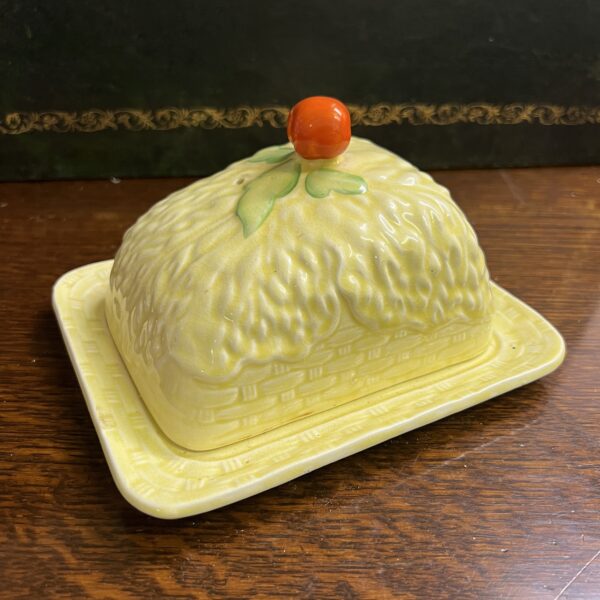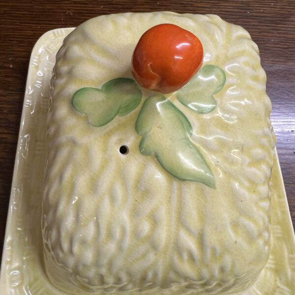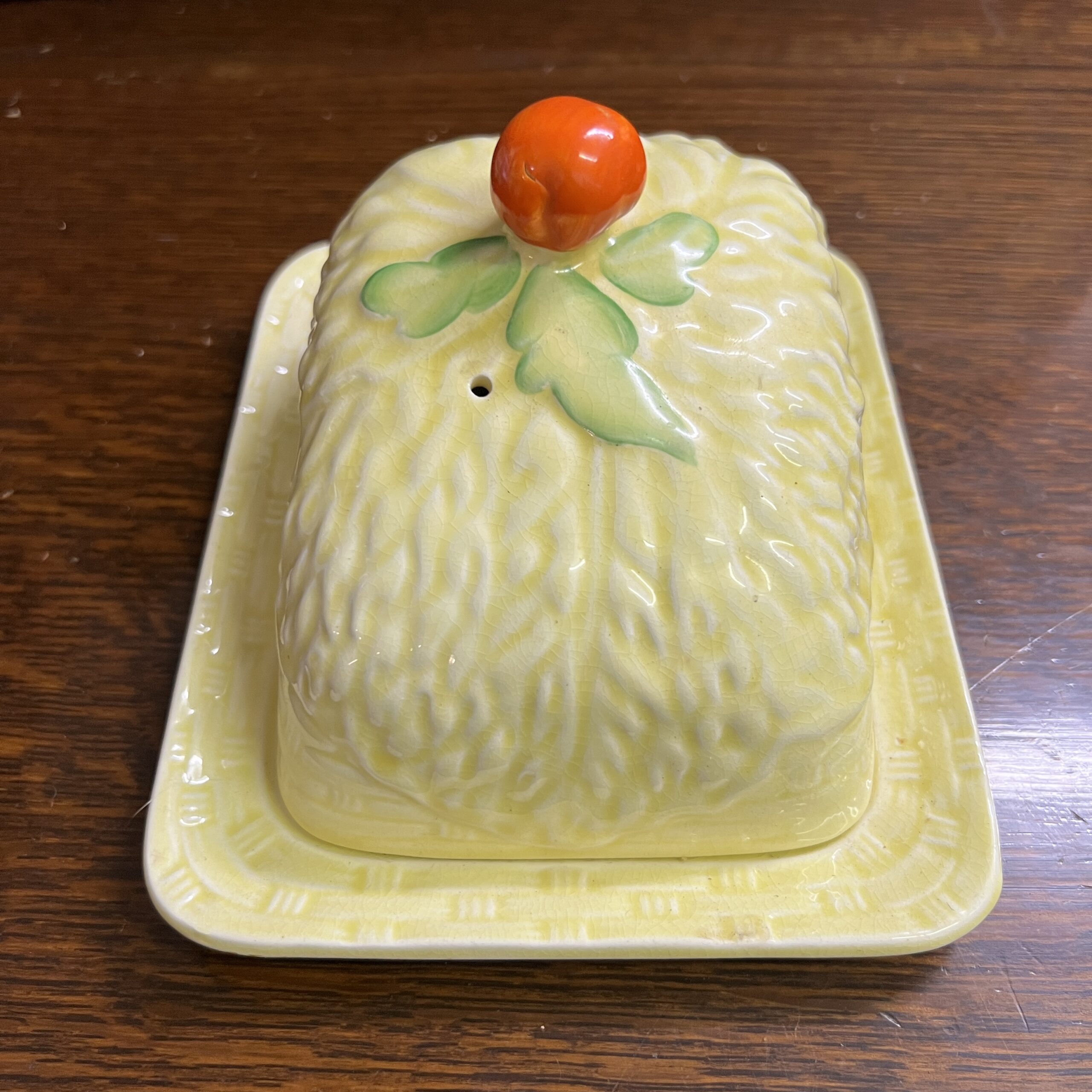 Yellow Midwinter Buslem butter dish with cabbage leaf and tomato handle