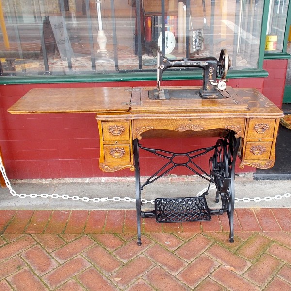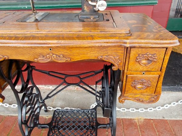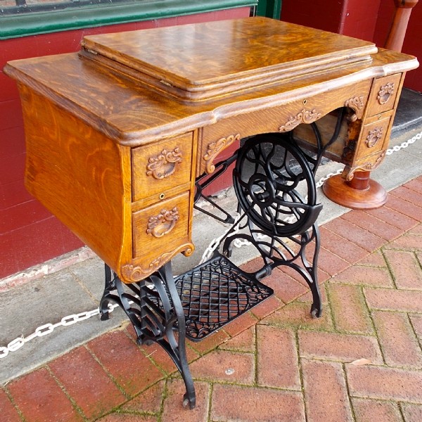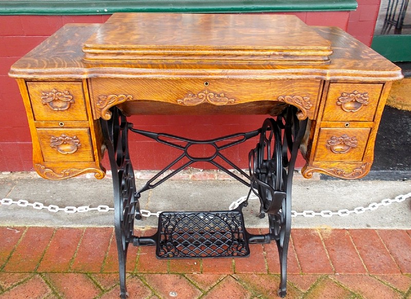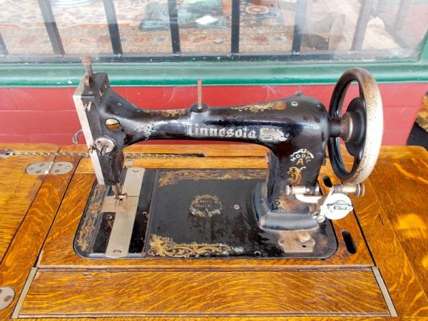 An oak cased Minnesota Model “A” treadle sewing machine made for Sears by Davis Sewing Machine Co. of Dayton, Ohio, before 1910. Having two drawers on either side plus a single central drawer, the machine automatically is raised and lowered when opening.