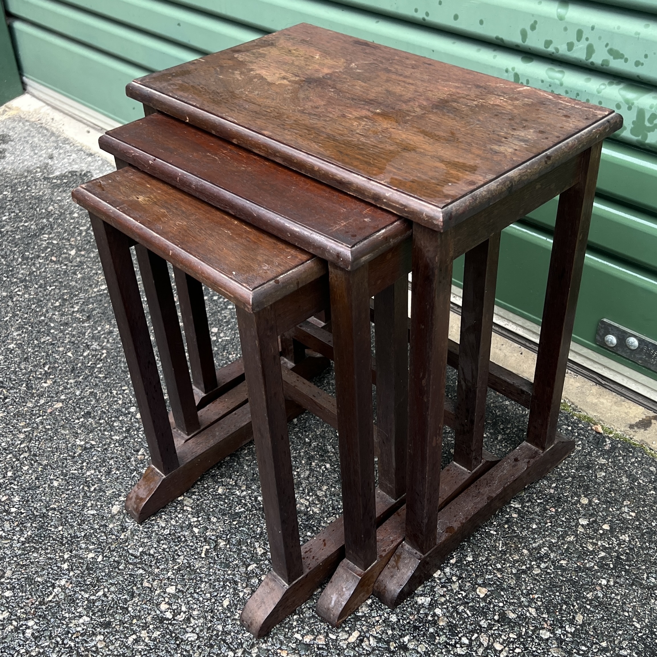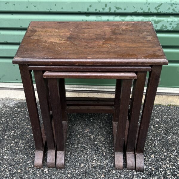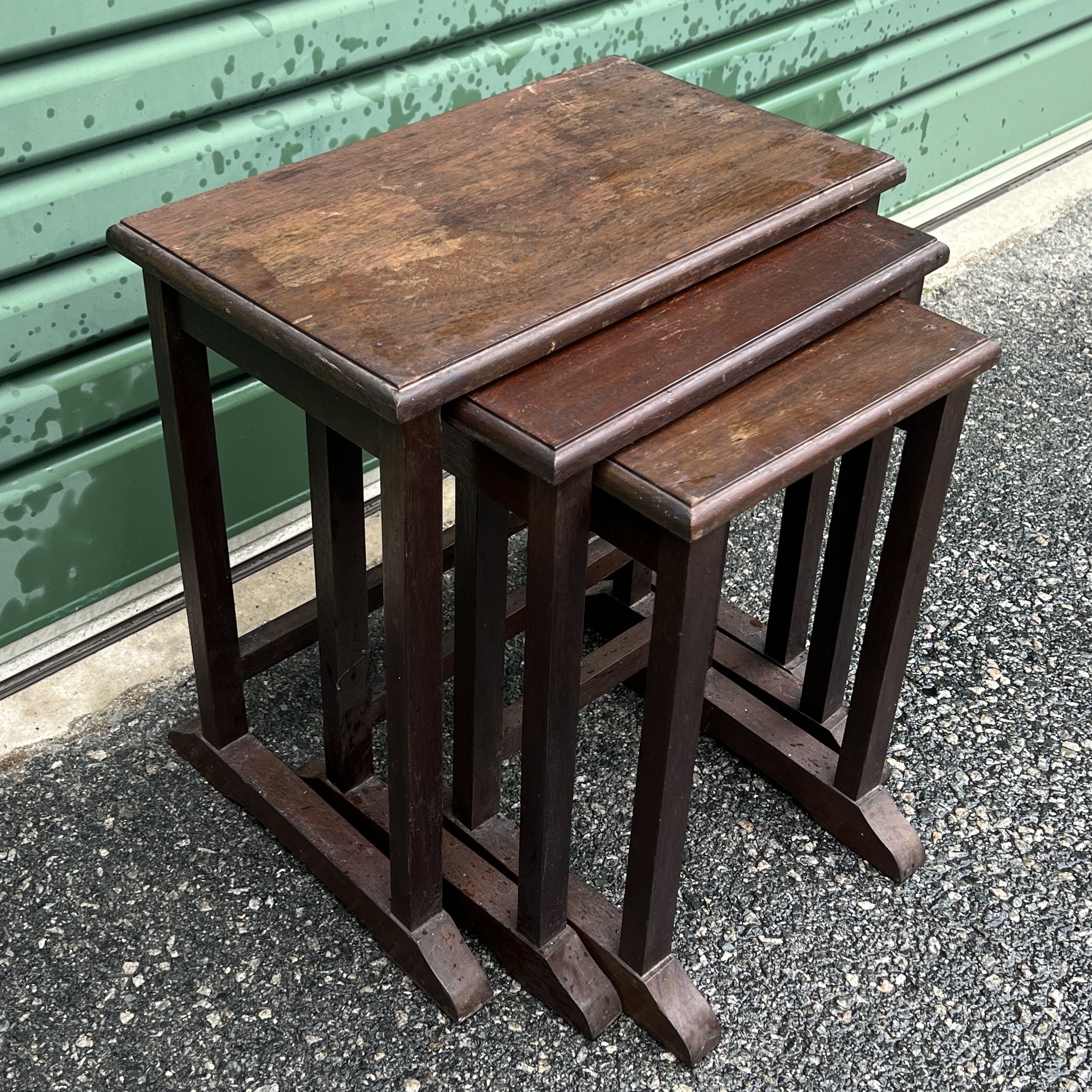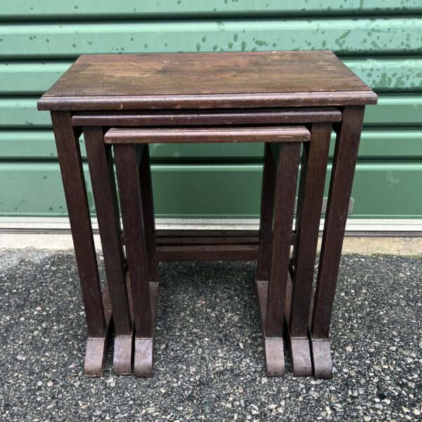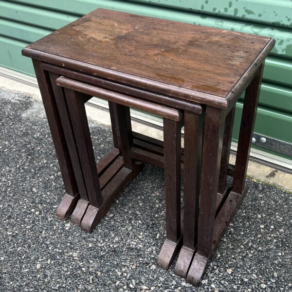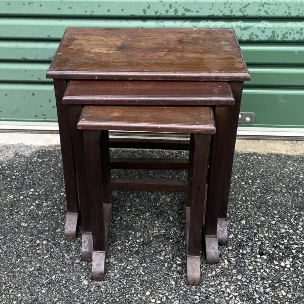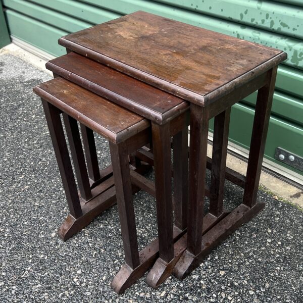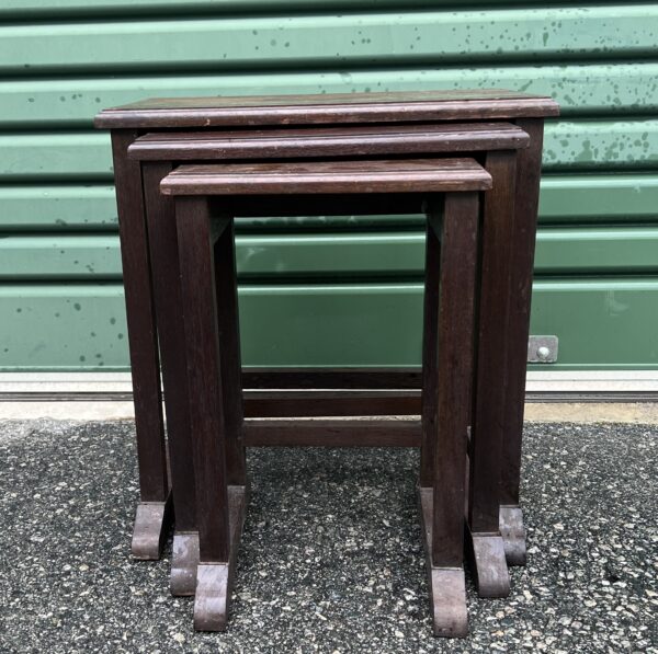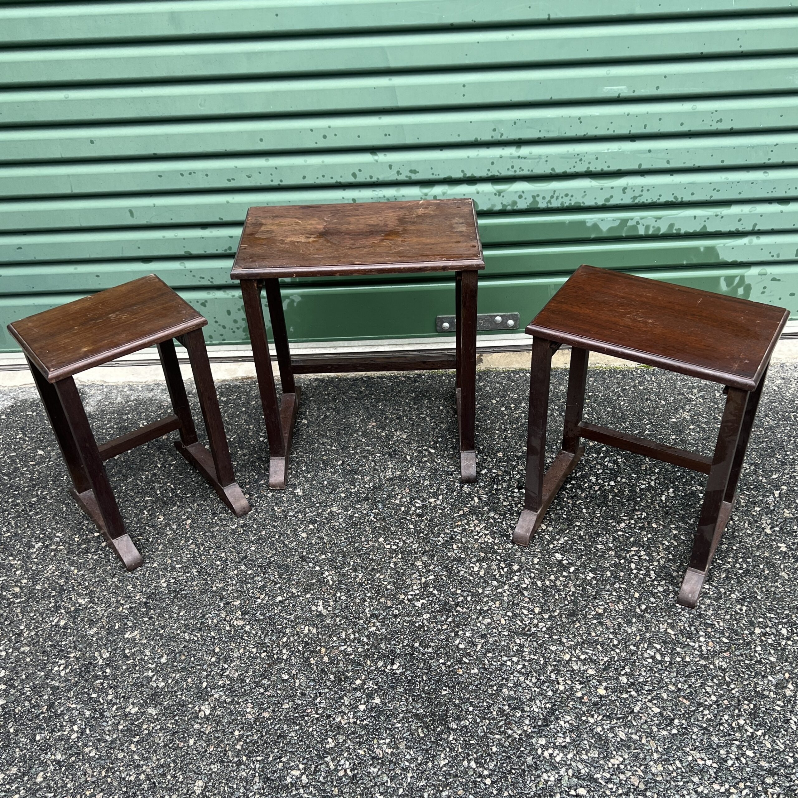 A sturdy nest of 3 West Australian Jarrah tables on square legs and skids. $495 restored/re polished. See our restorations page.
