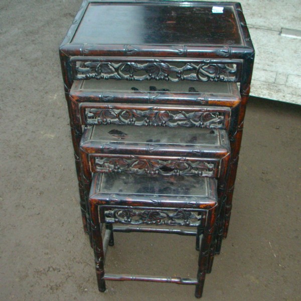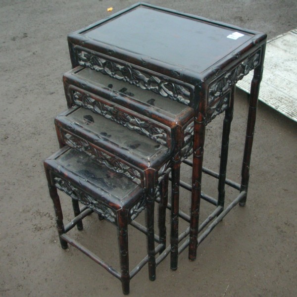 Four late 19th century/early 20th century Chinese rosewood nesting tables each with foe bamboo legs and carved foliage rails and stretchers.