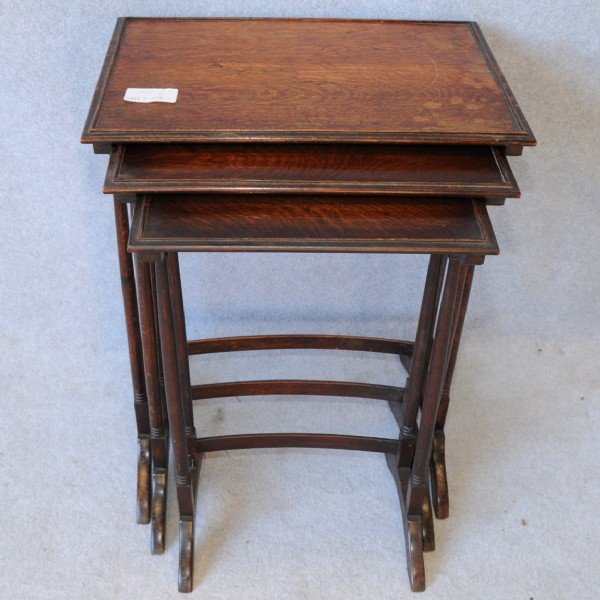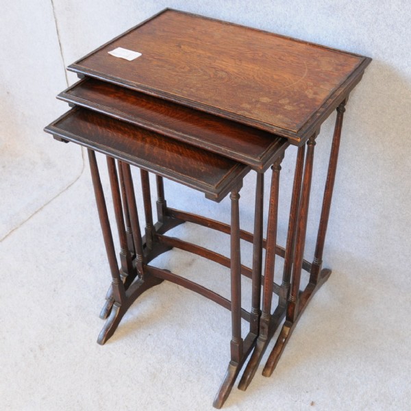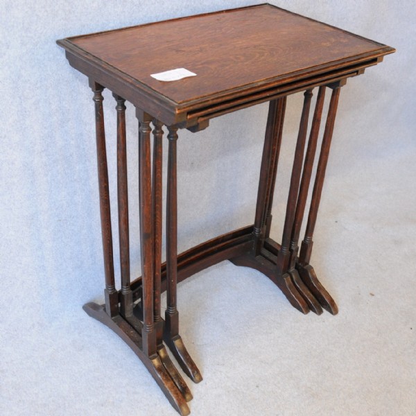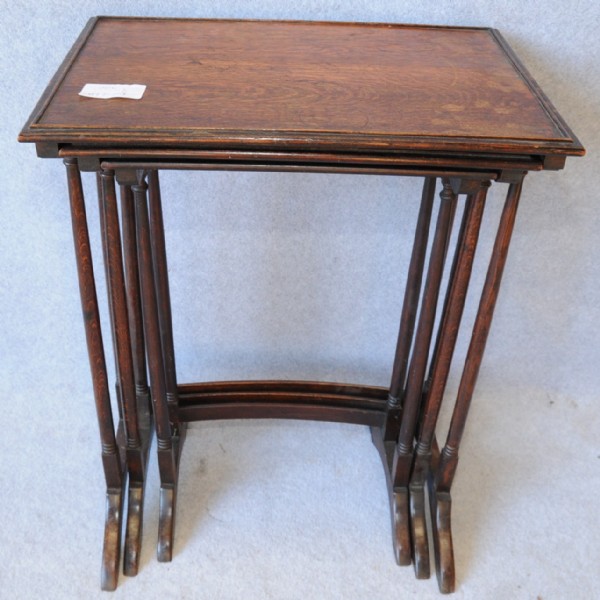 A nest of three 20th Century Oak Tables, plain rectangular tops, raised on ring turned spindle supports, terminating in splay feet. Size:69 high x 53 wide x 36cm deep.