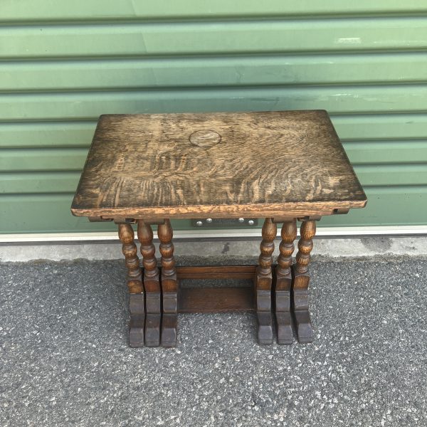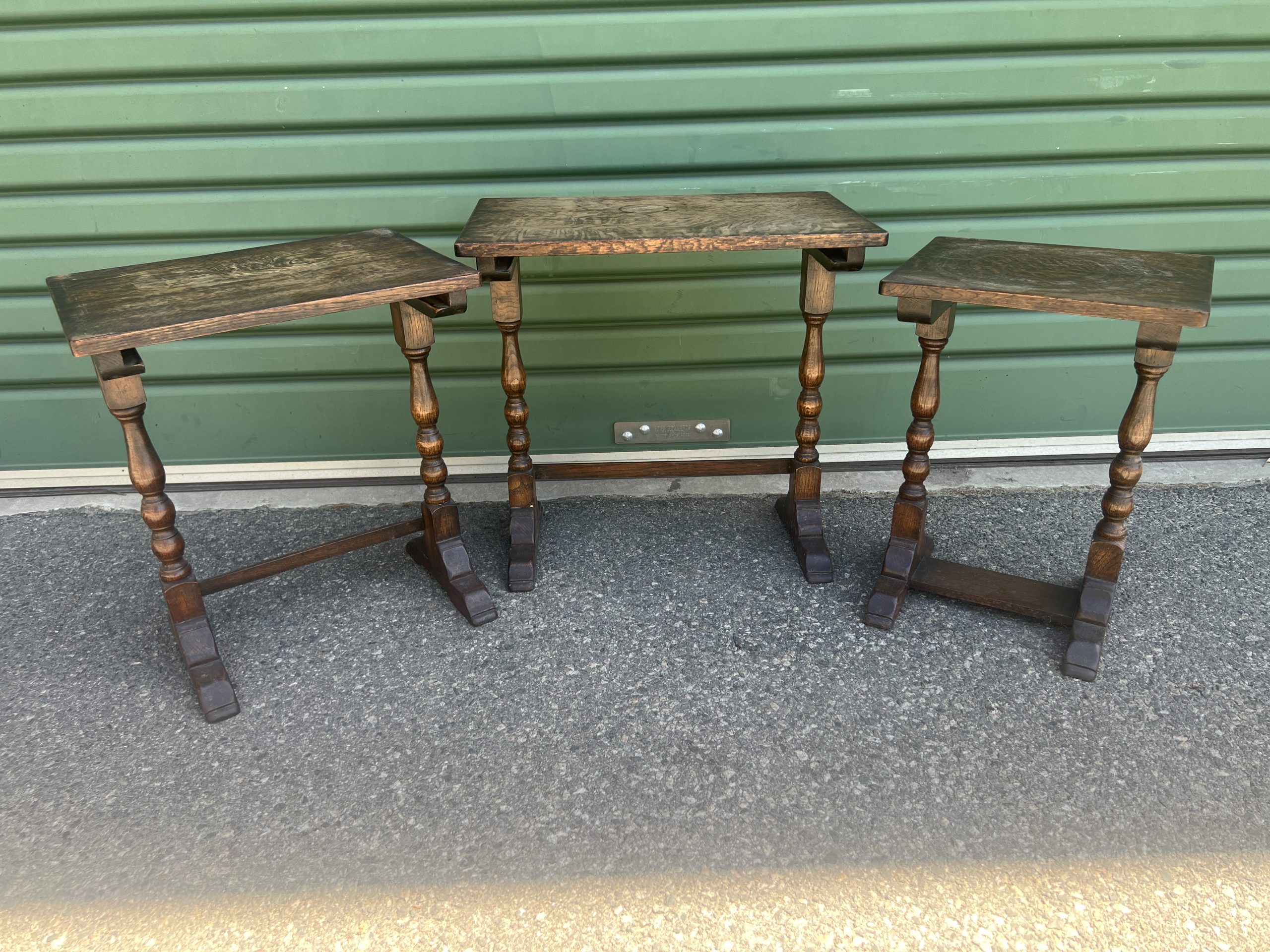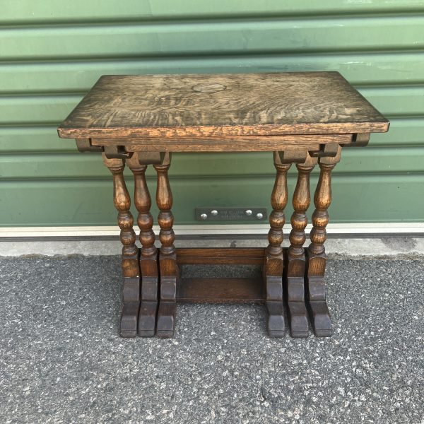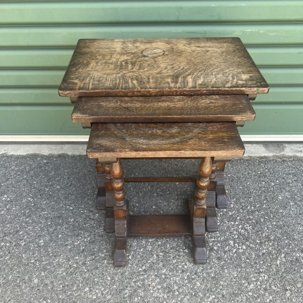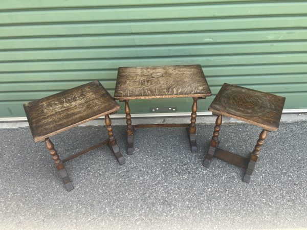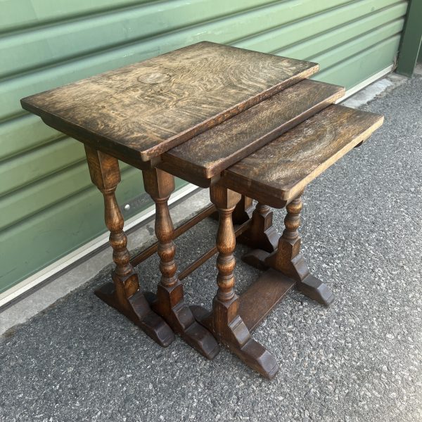 A nest of three oak tables graduating down in size each with bobbin turned pedestal legs Restored/repolished $645
