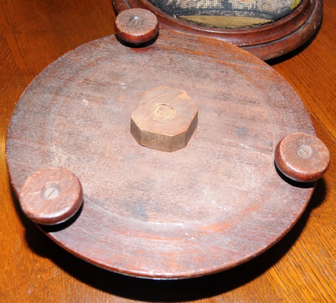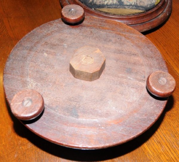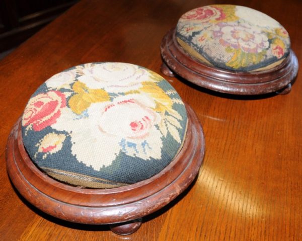 A pair of Victorian mahogany circular foot stools with removable tapestry cushions fixed in place with a timber screw thread. Raised on three bun feet.