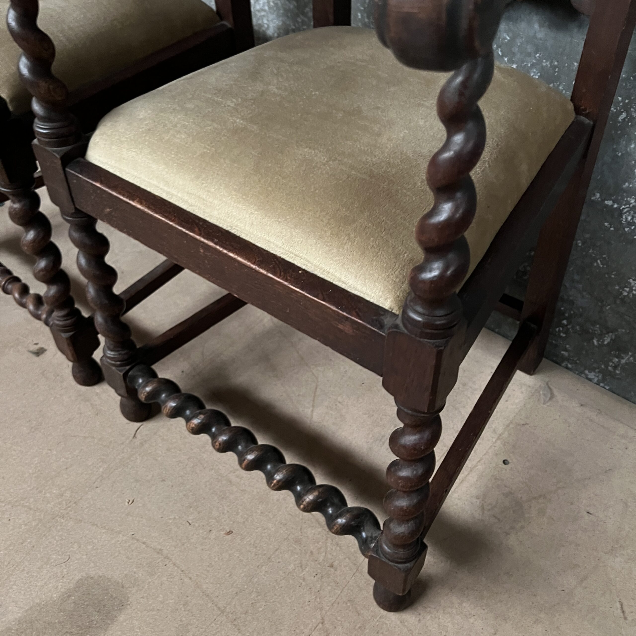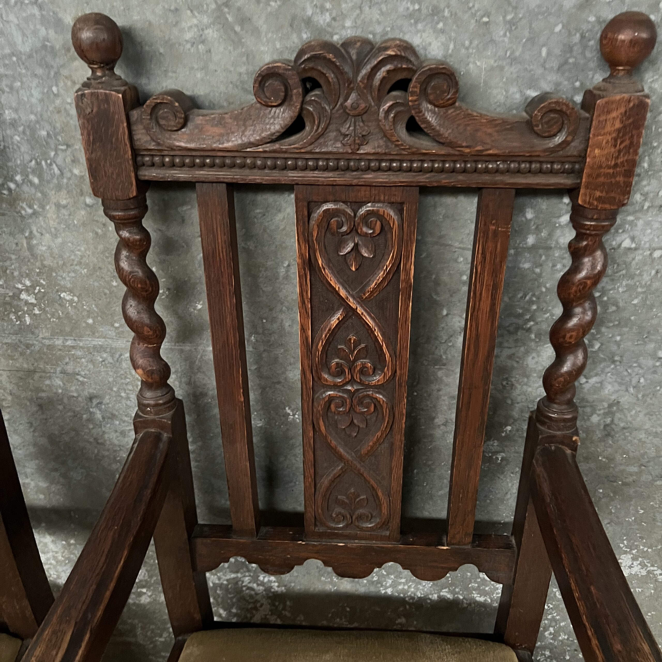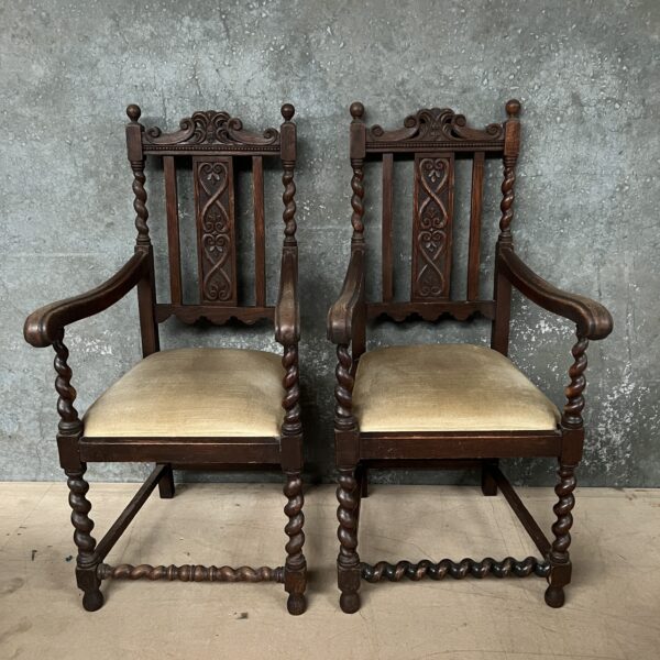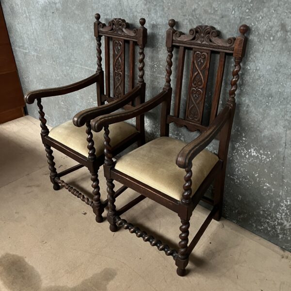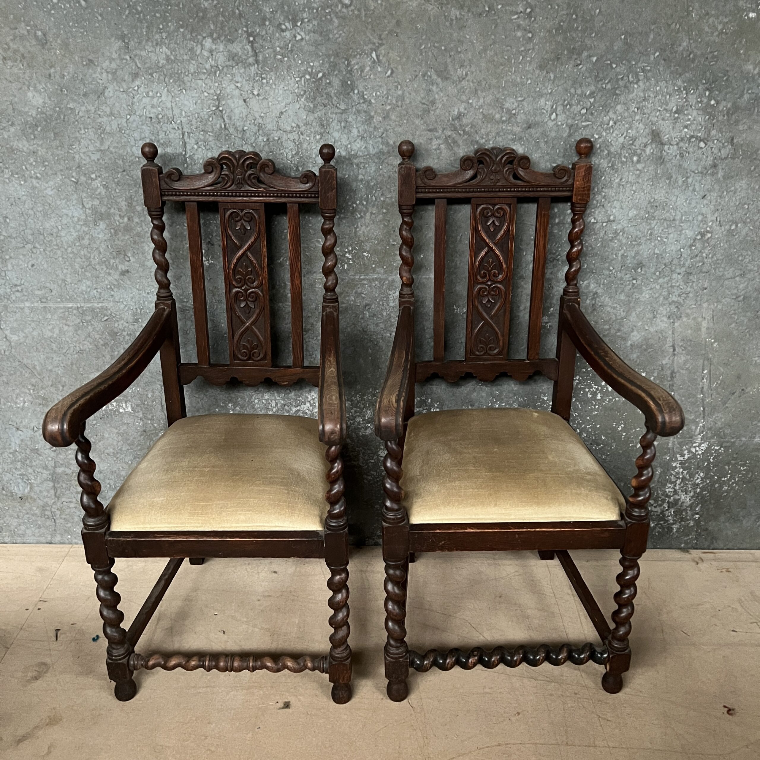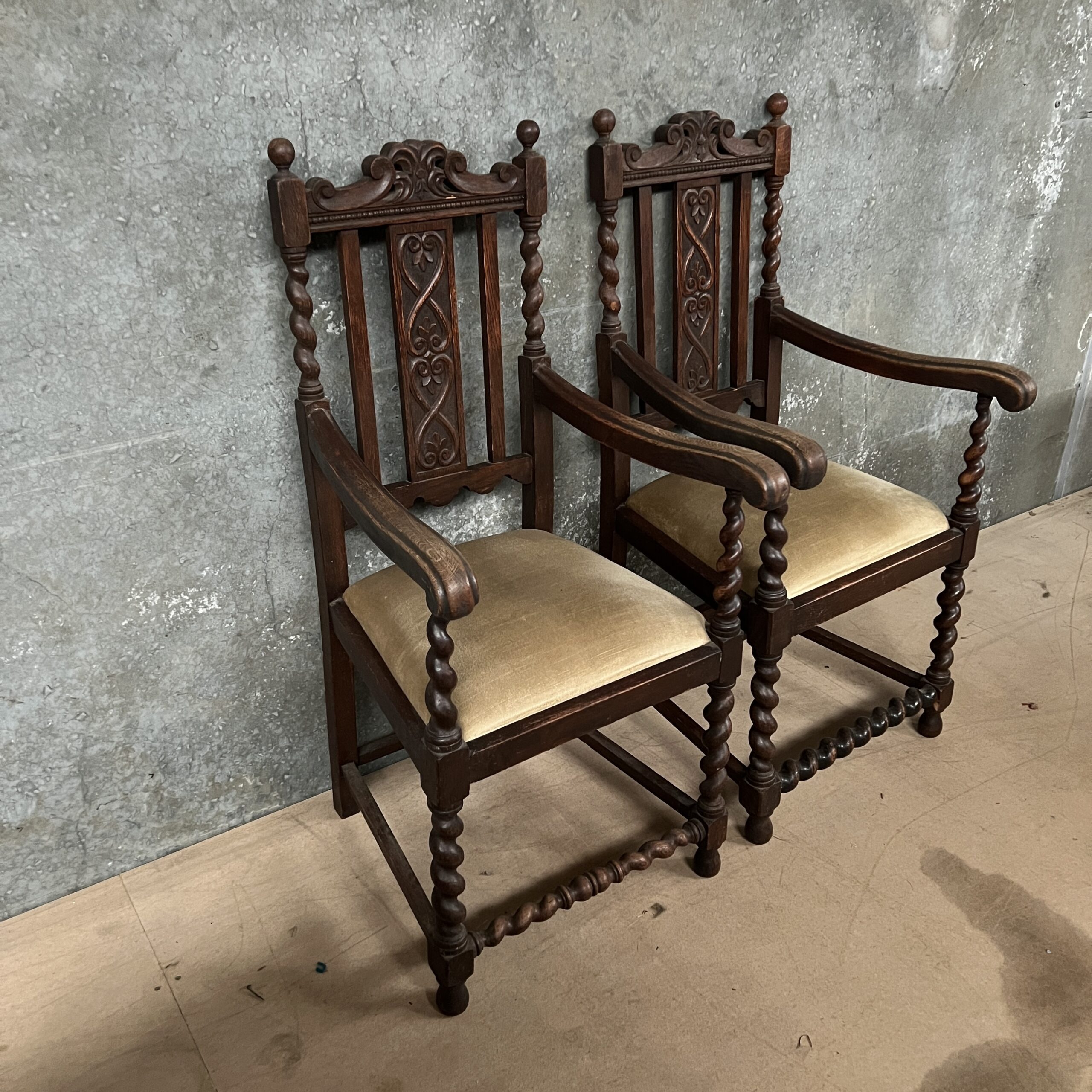 A pair of oak Jacobean style arm chairs with twisted legs, supports and stretchers Re polished $995