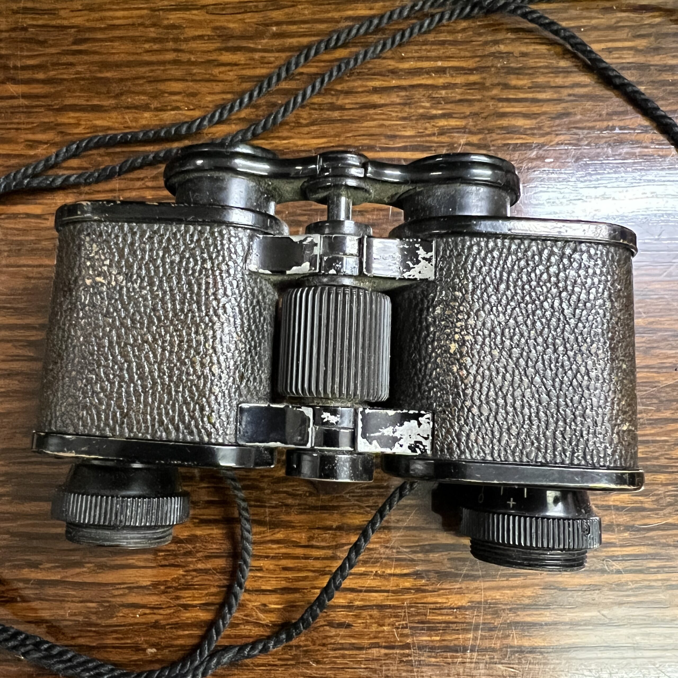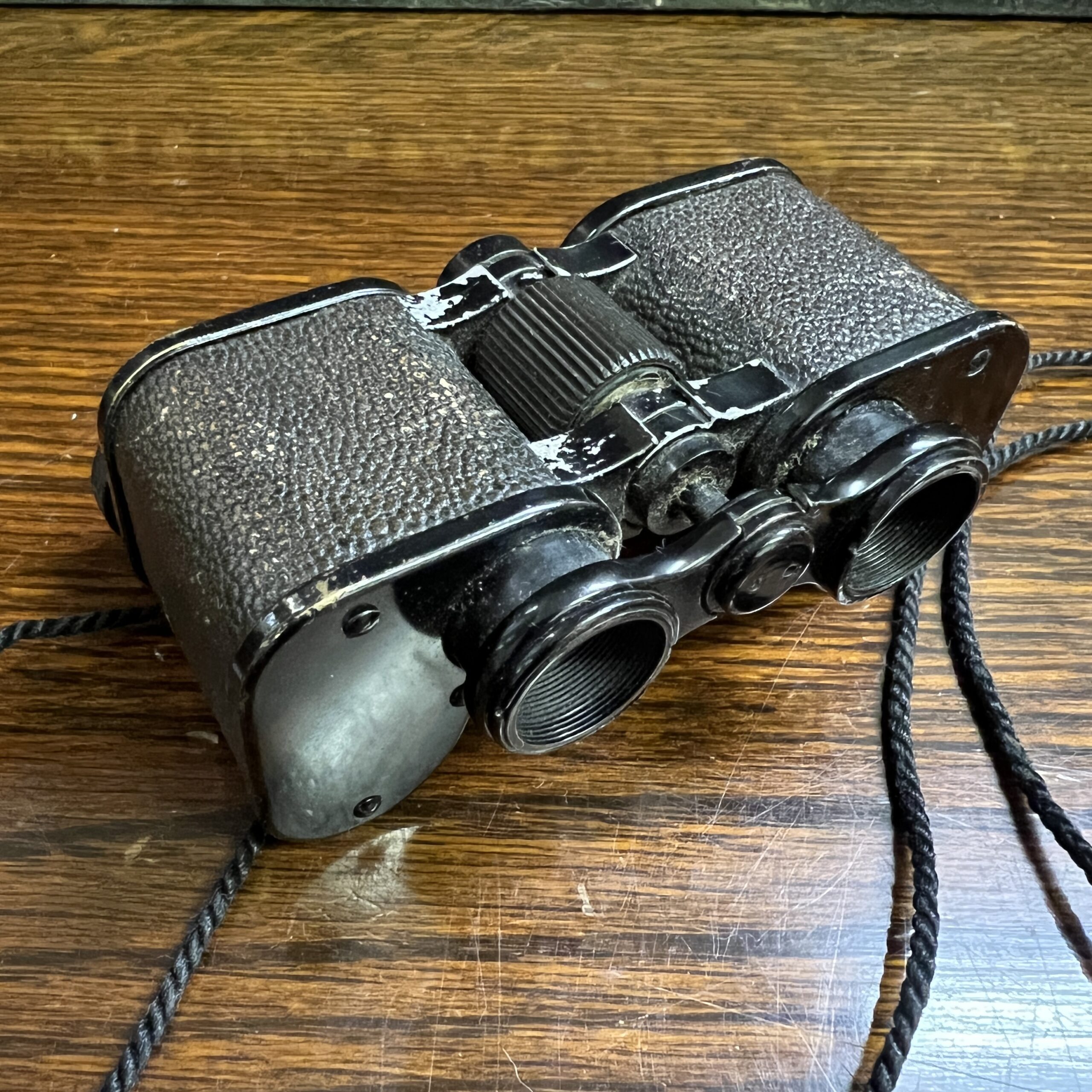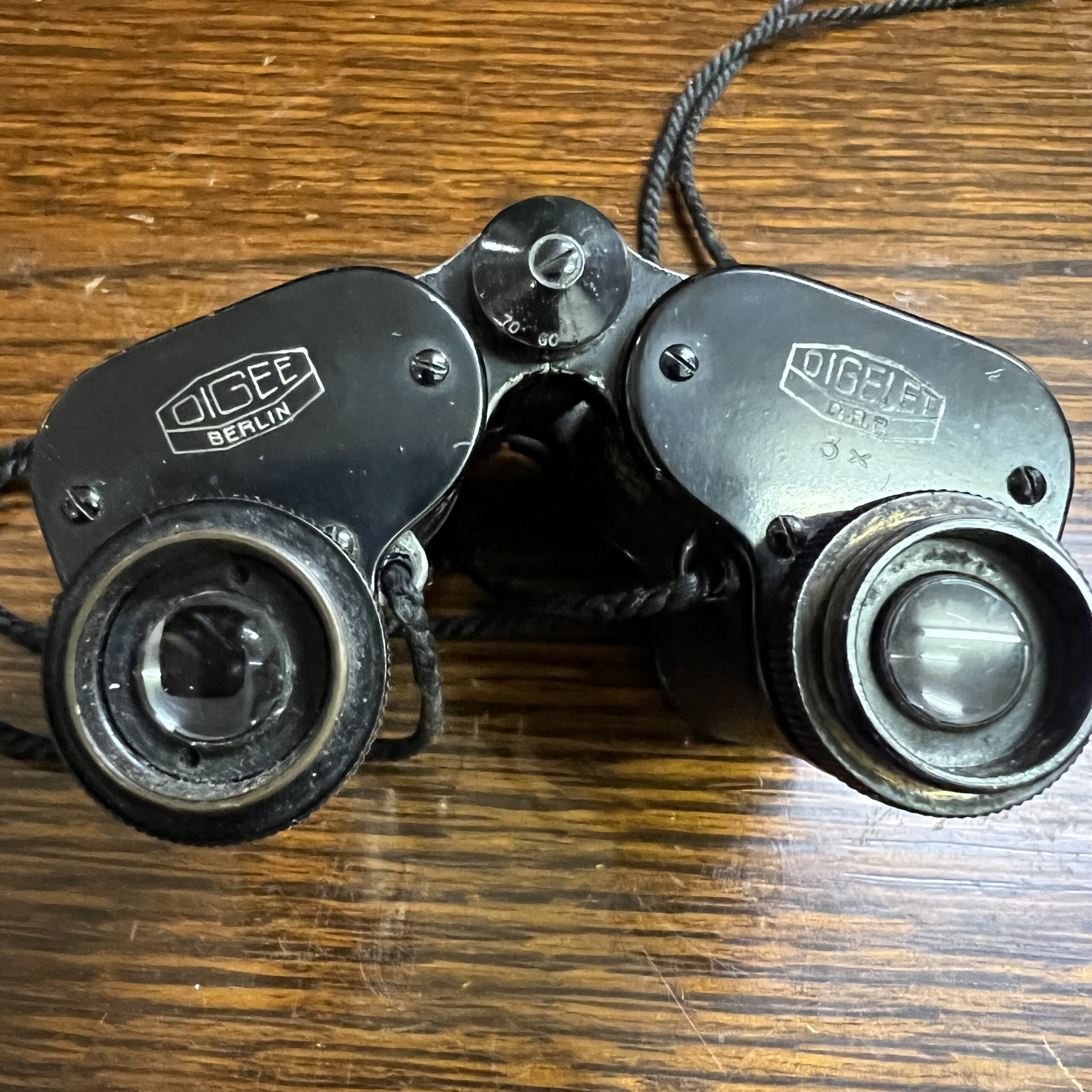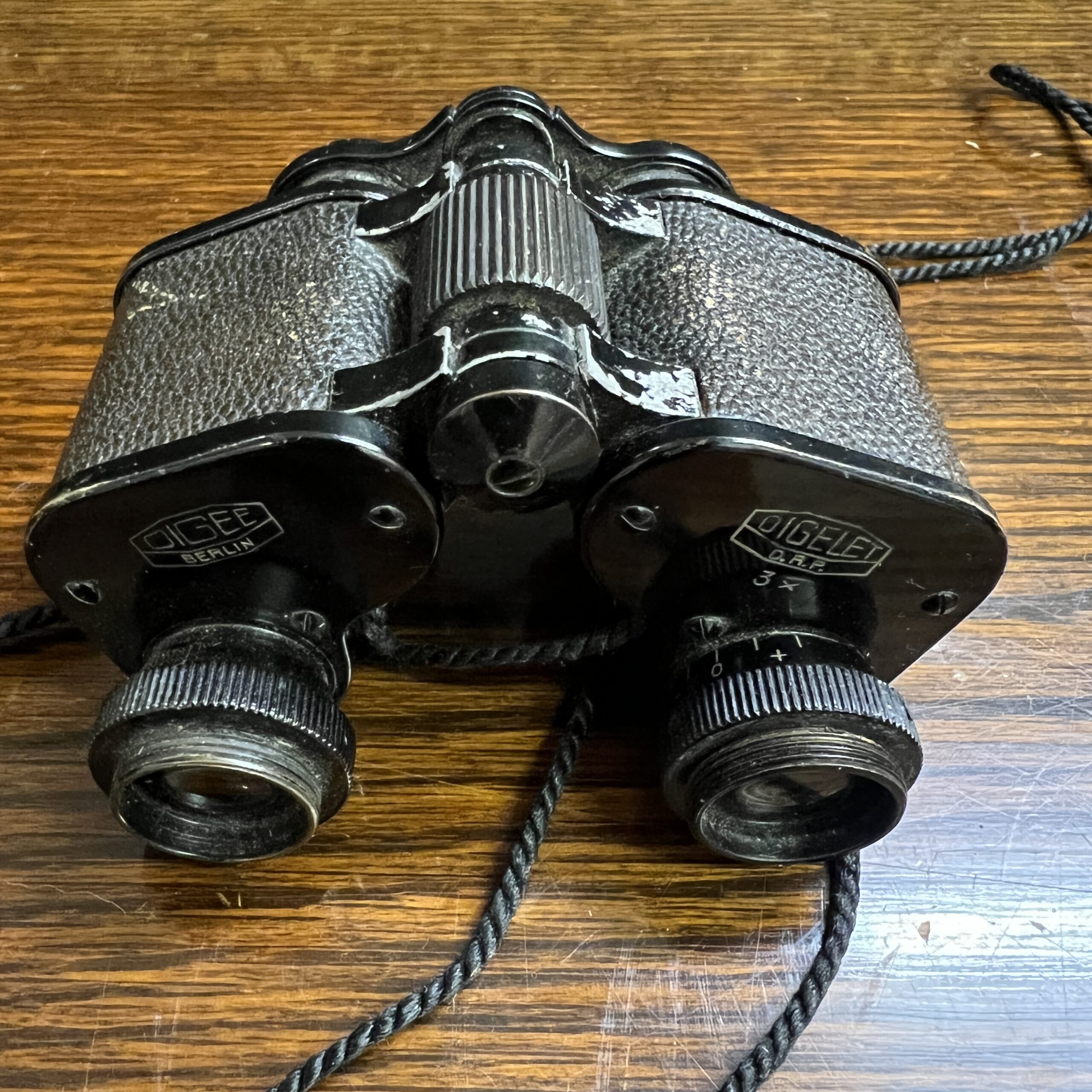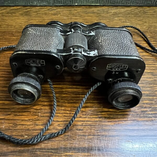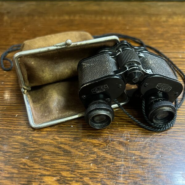 A pair or early 20th century German miniature binoculars/theatre glasses bound in shagreen (shark skin) marked Gigelet DRP Olgee Berlin 3 x zoom in a velvet case with gilt clip