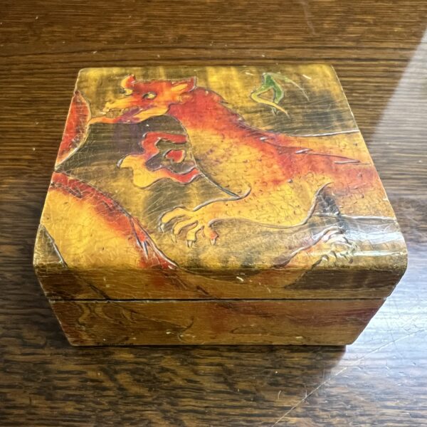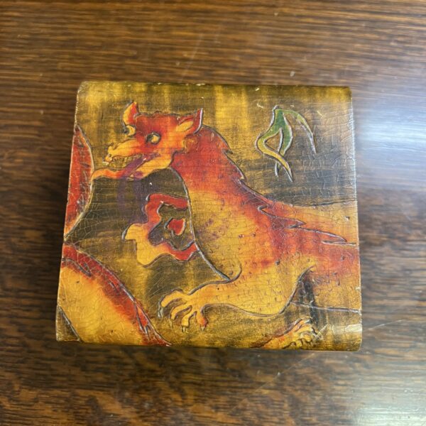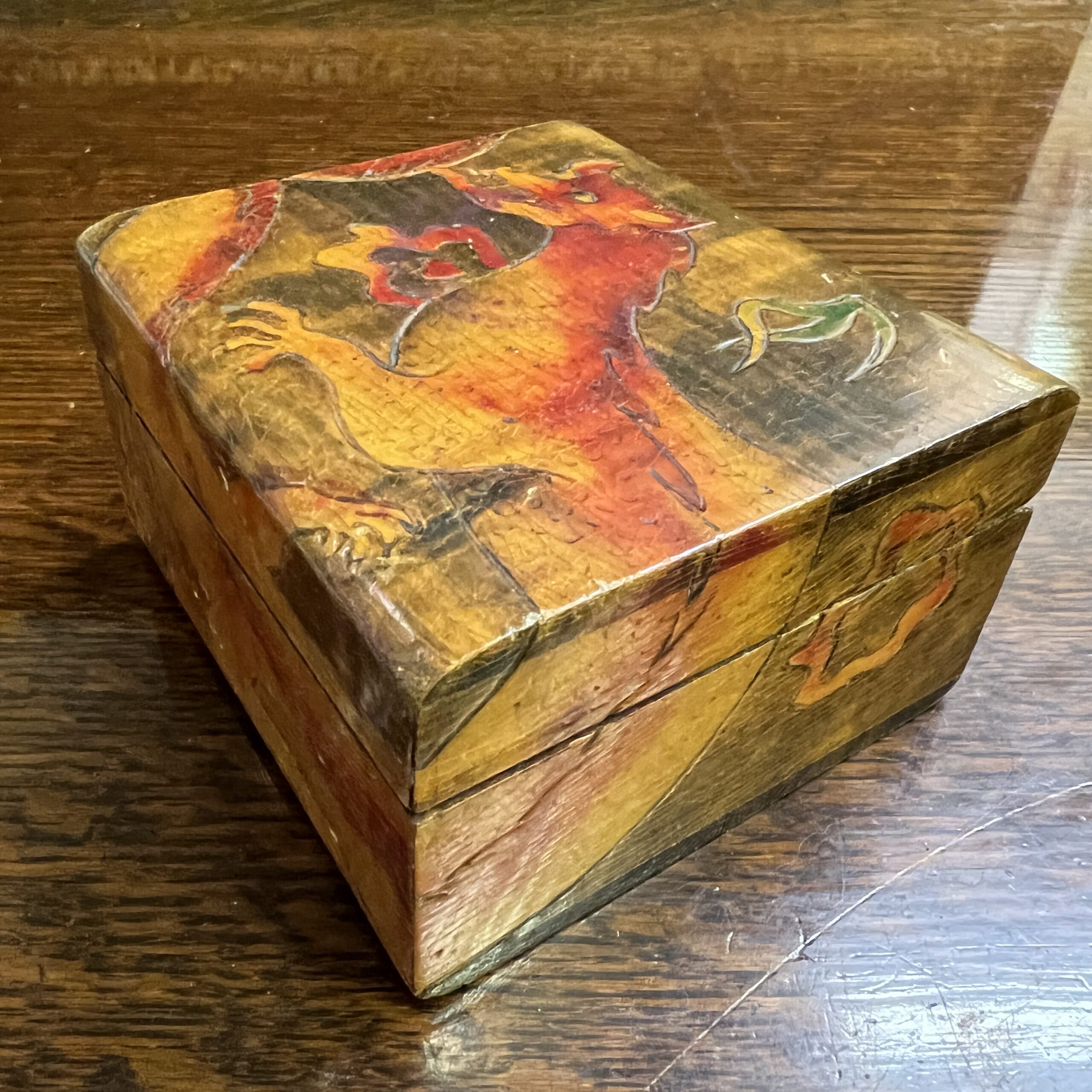 A Vintage Pokerwork wooden box with dragon decoration signed C.Harrison
