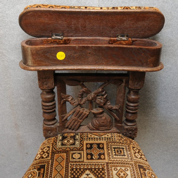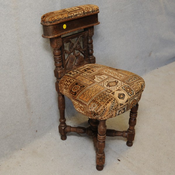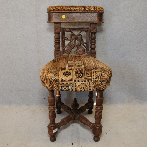A 19th century Prie Dieu with a carved back. The seat and top rail are upholstered the top rail hinges open for storage (perfect for hiding the family jewels) raised on turned legs united by an X stretcher.