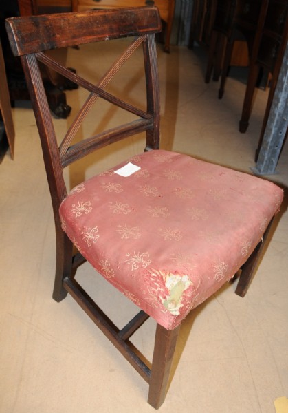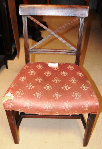 A Regency Mahogany dinning chair the back with X–shaped splat, raised on square tapering legs. The restored price includes re-upholstery.