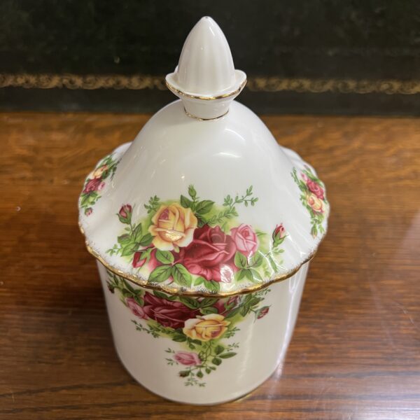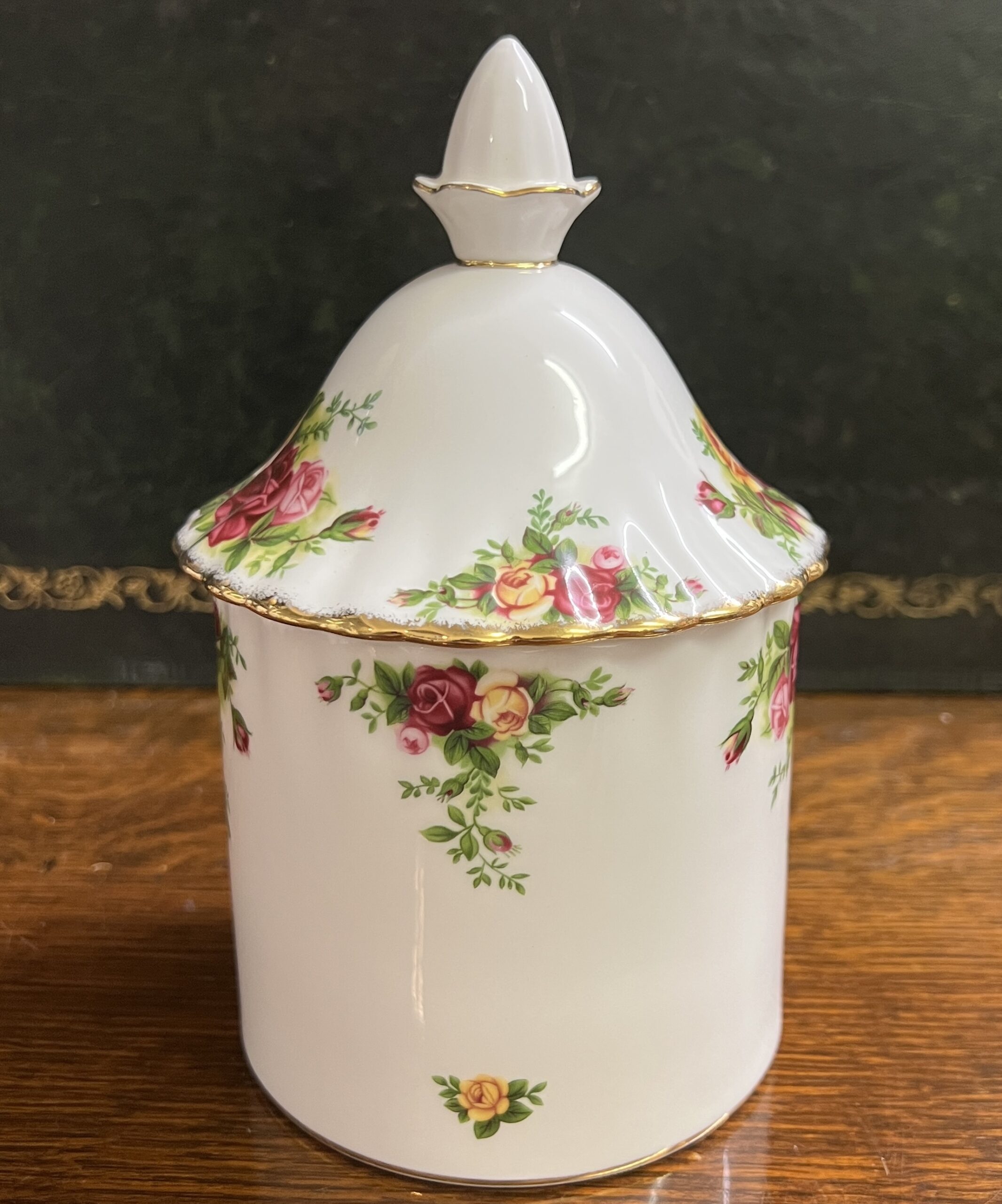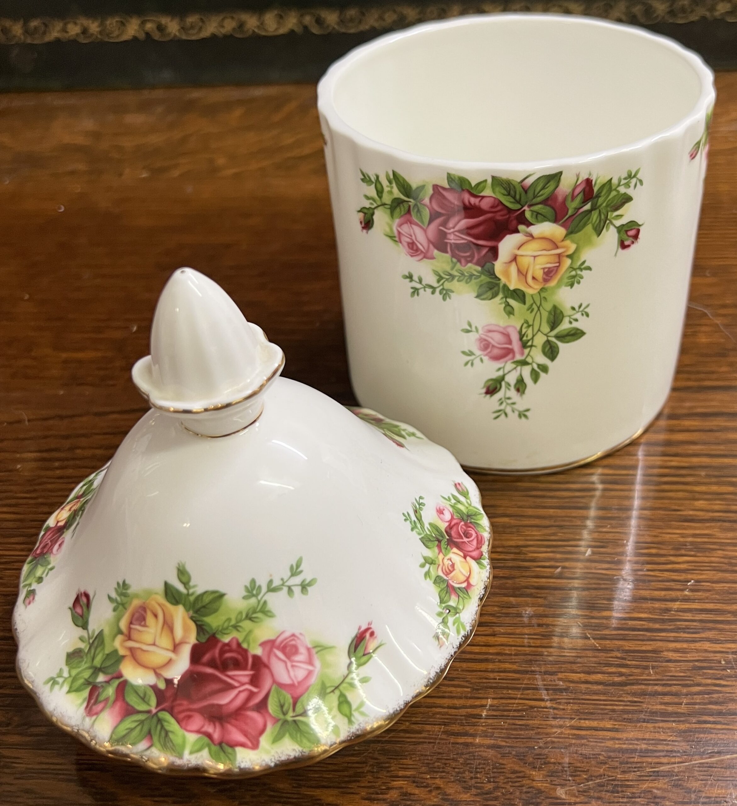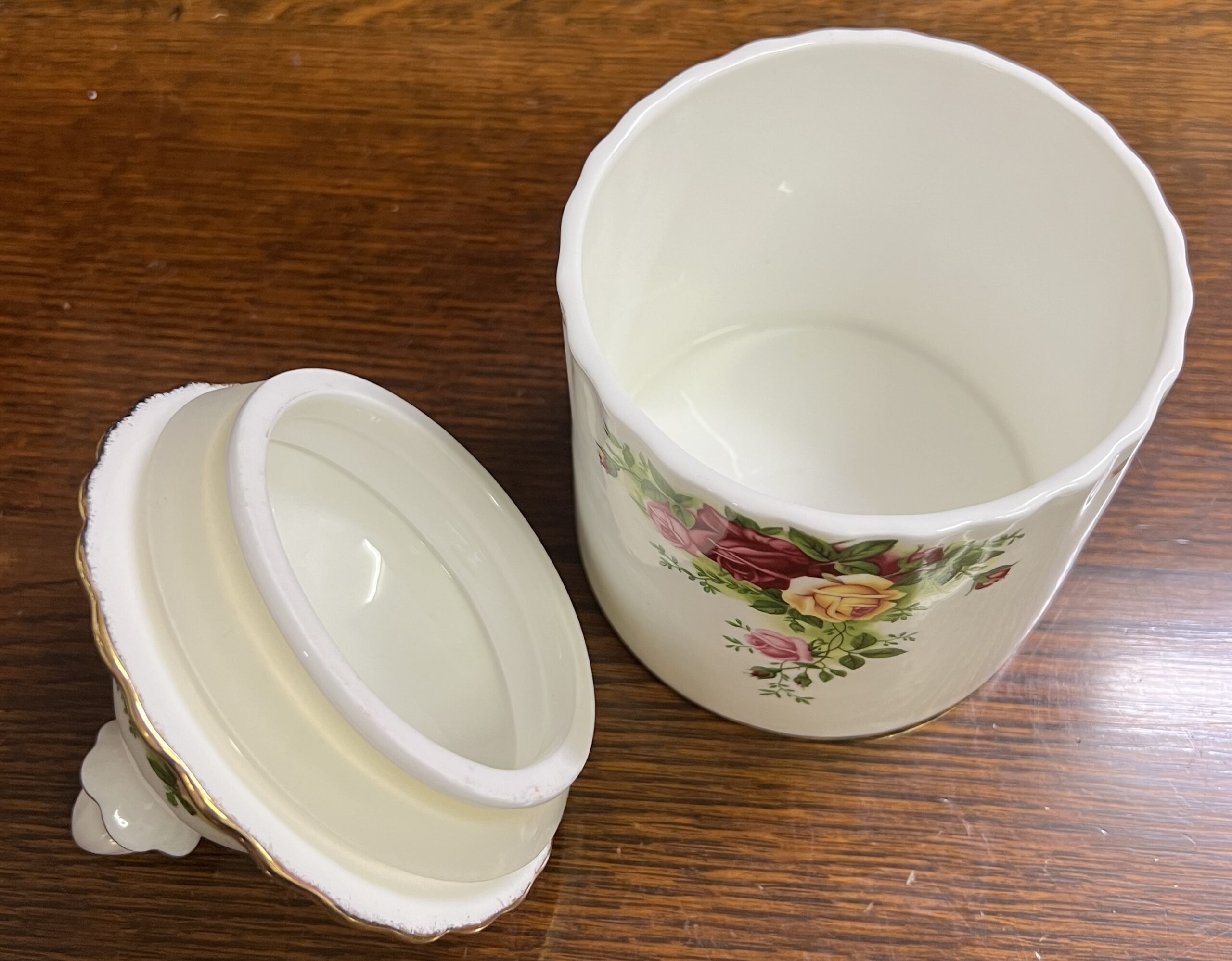 A Royal Albert old country roses lidded canister made in England 190 x 115 one of two that I have.