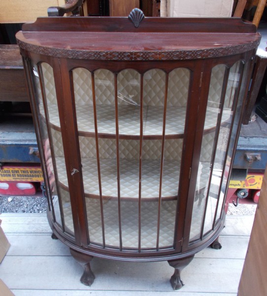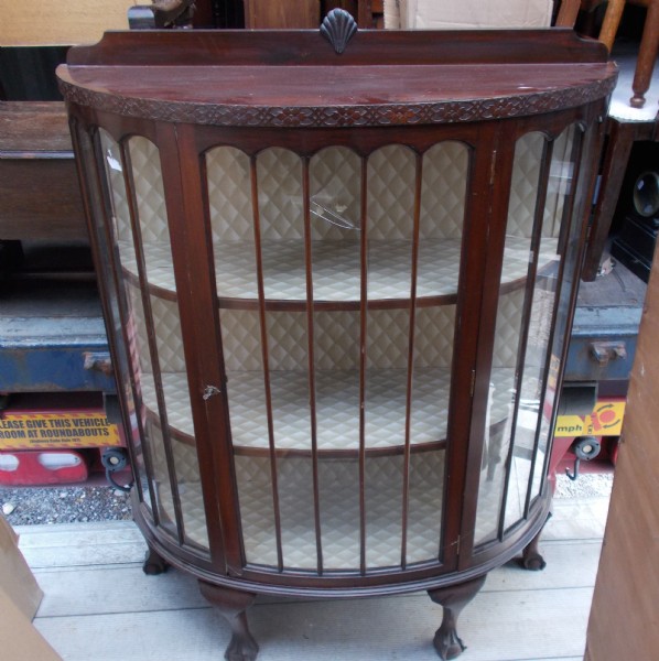 A mahogany semi circular display cabinet, the shape upstand having a carved detail, the top edge has a decorative blind fretwork band the door and panels have arched glazing. It has Queen Anne legs with carved ball and claw feet
