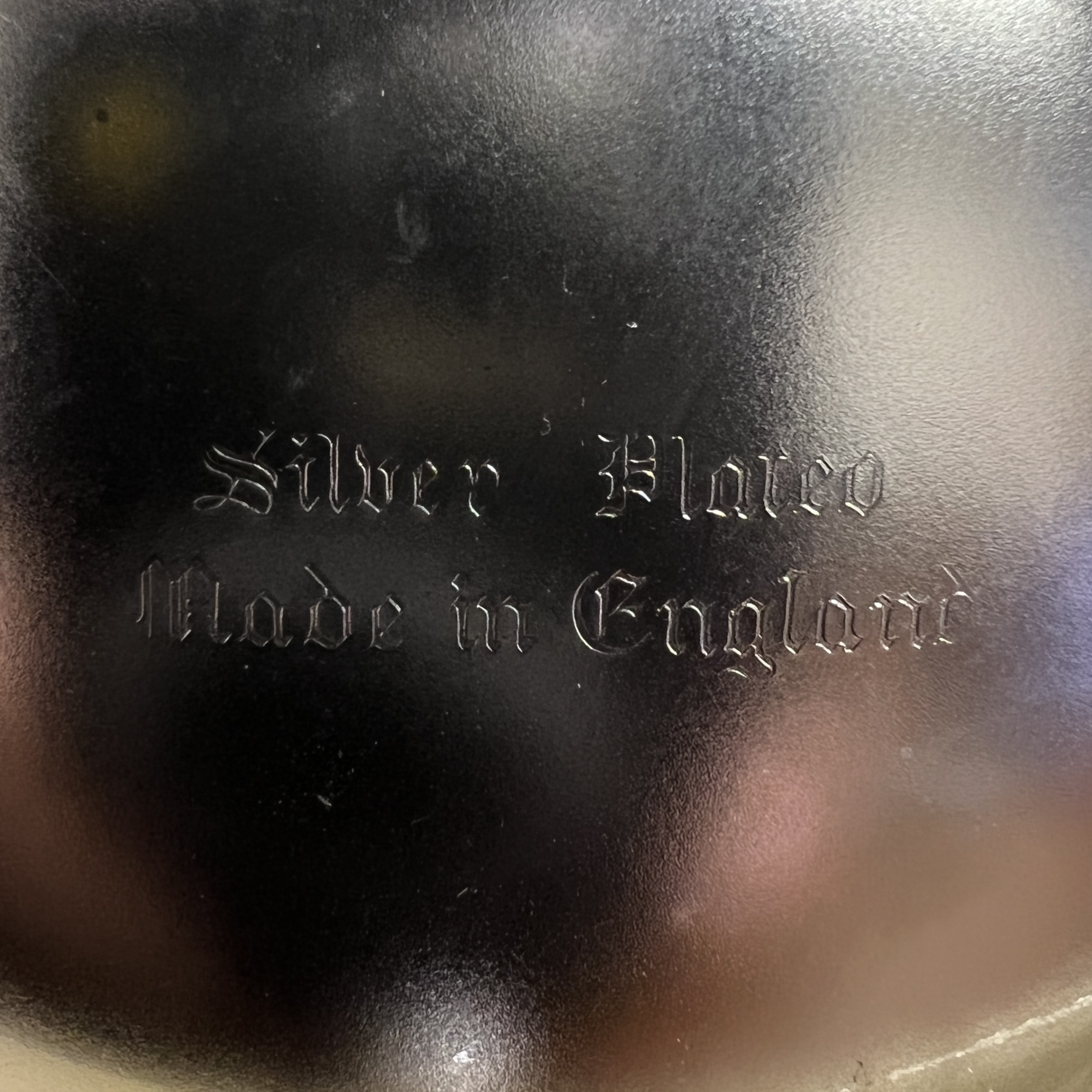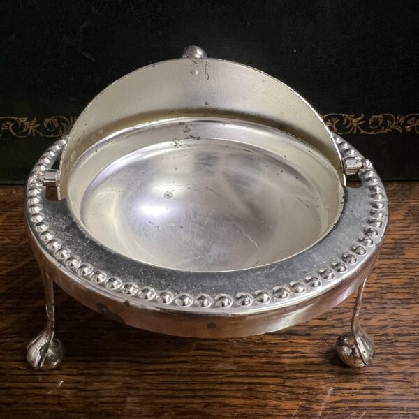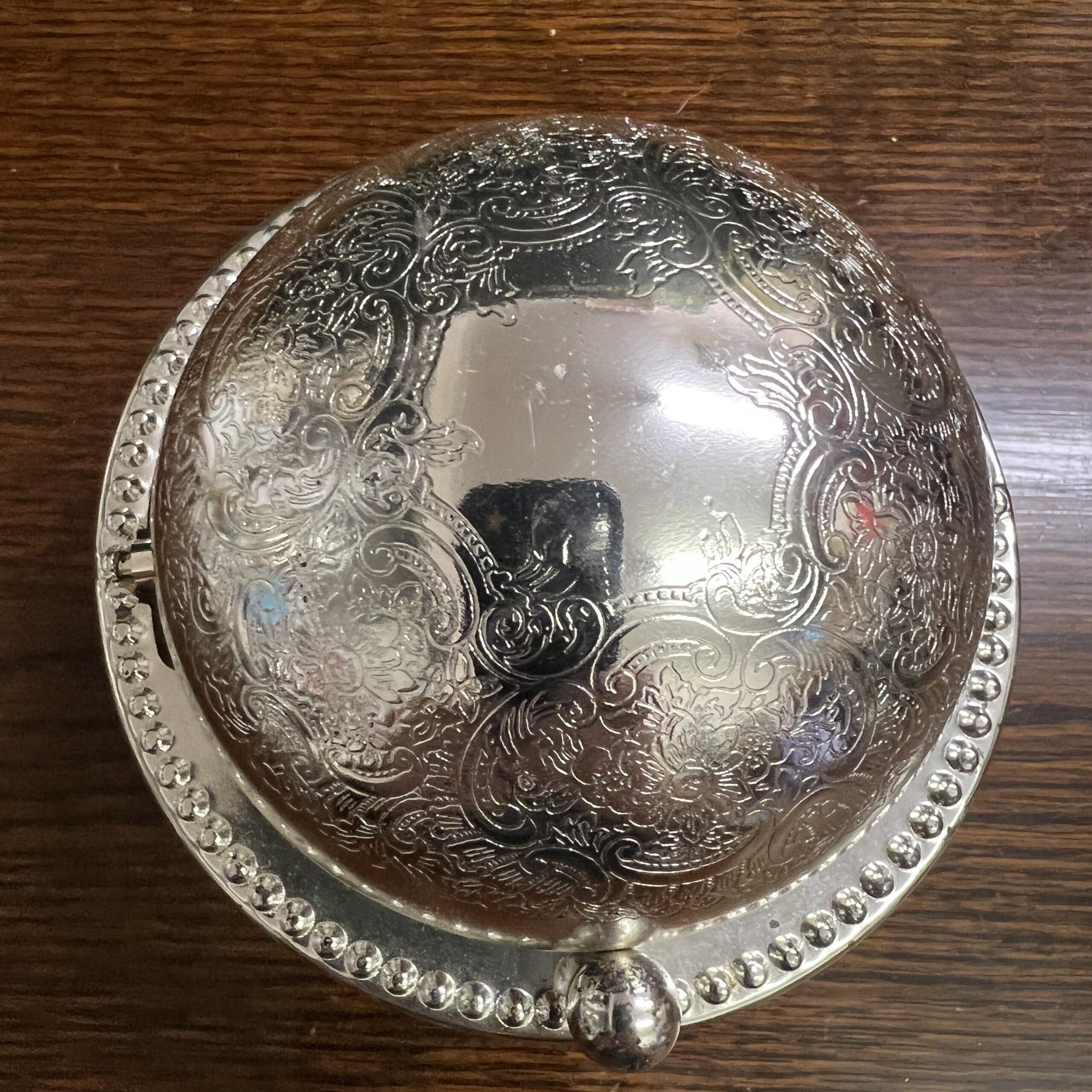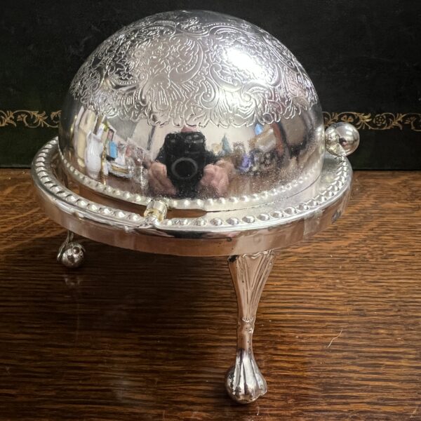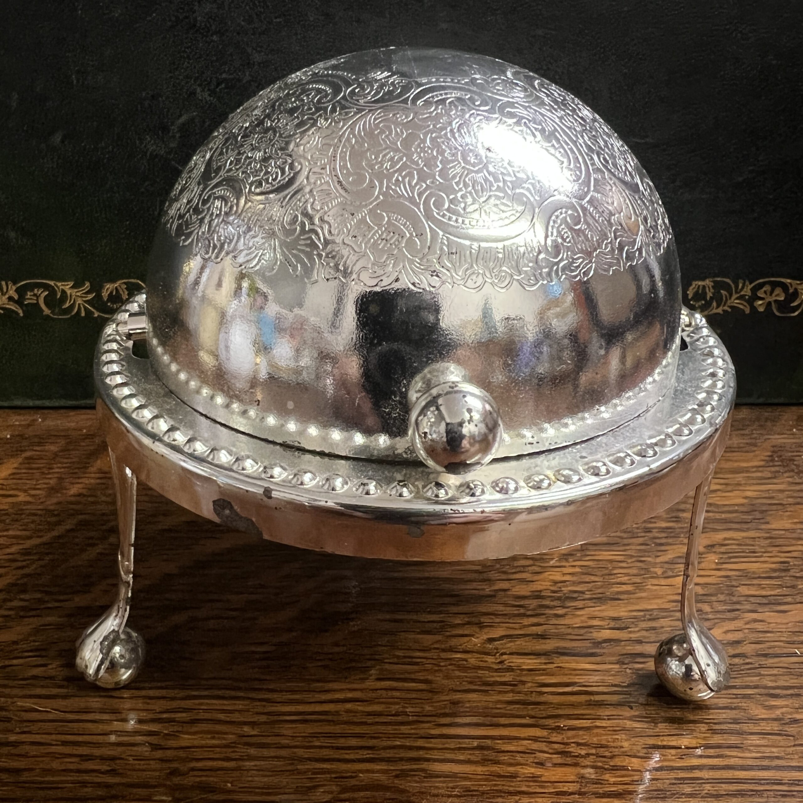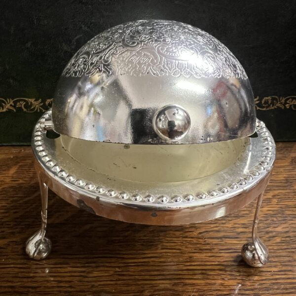 A Silver plated raised serving bowl with an engraved pivoting cover c1960