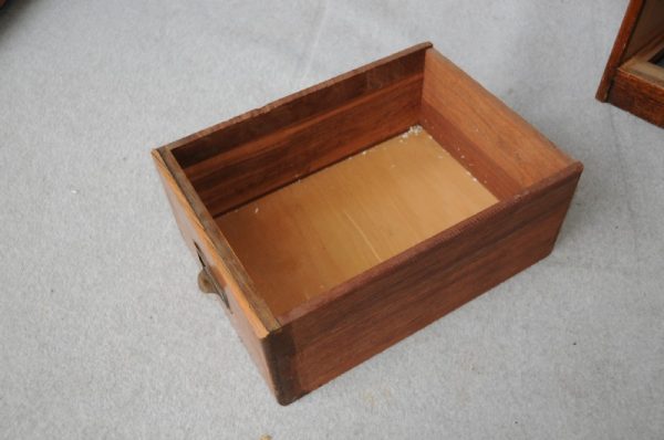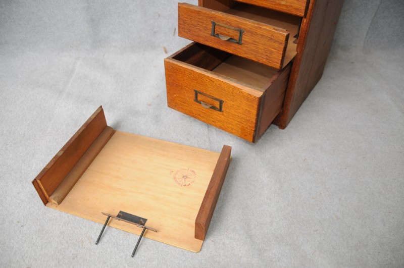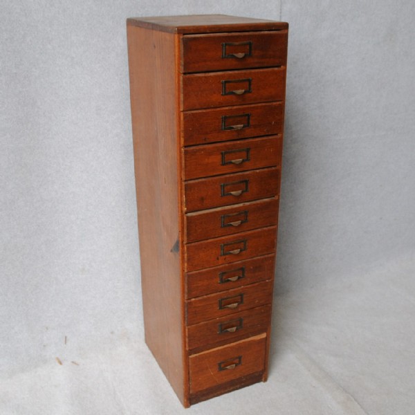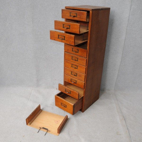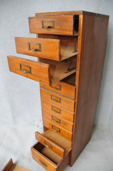 A Tasmanian oak filing cabinet with eleven drawers each with steal handle and label slot, the interior fitted with a hole punched paper spike. The bottom drawer has sides and has no paper spike (by design). Note there is also jarrah used in the drawer construction. Size: 121.5cm high x 32.5 wide x 41cm deep.