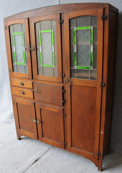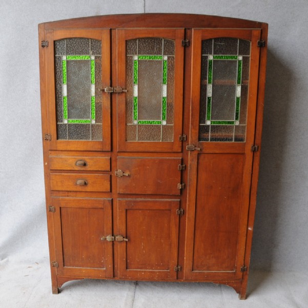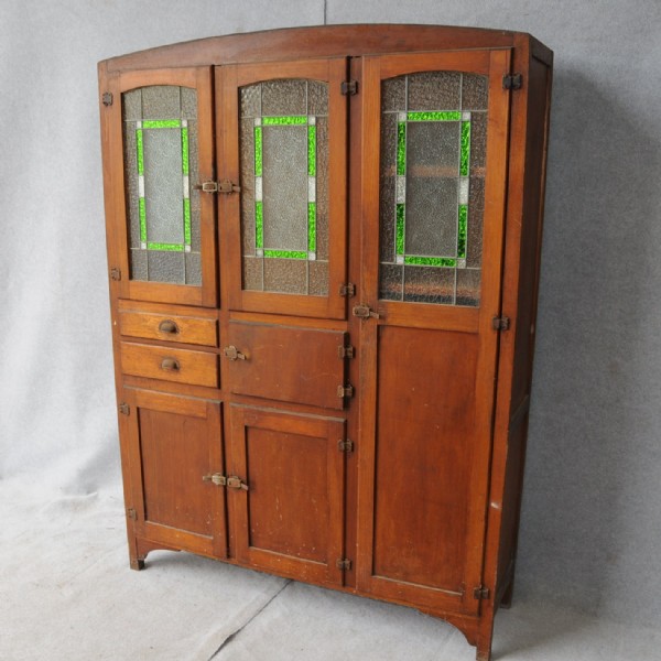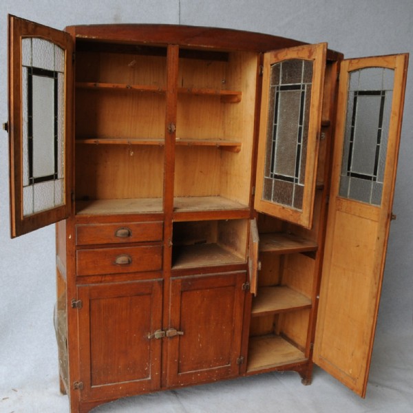 A Tasmanian oak kitchenette from the Art Deco period, the arched top over a series of doors and drawers. The upper section with lead light panels that enclose internal shelving. Size: 137cm wide x 38cm deep x 187cm high.