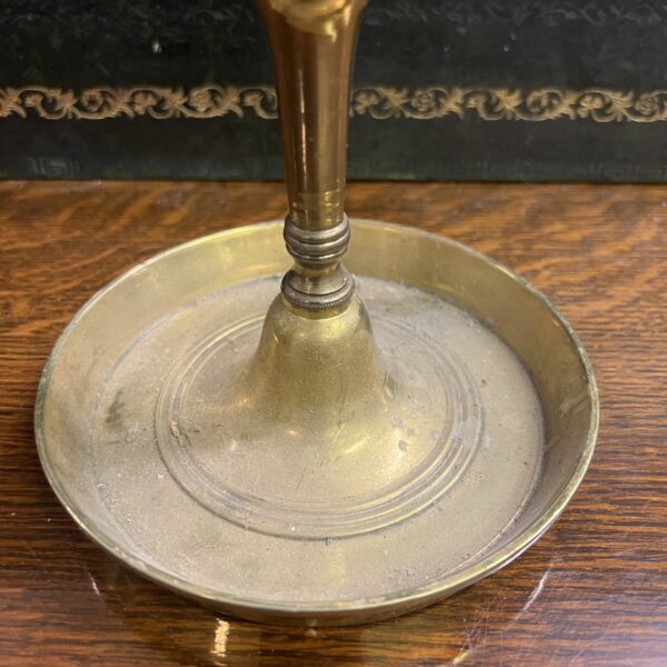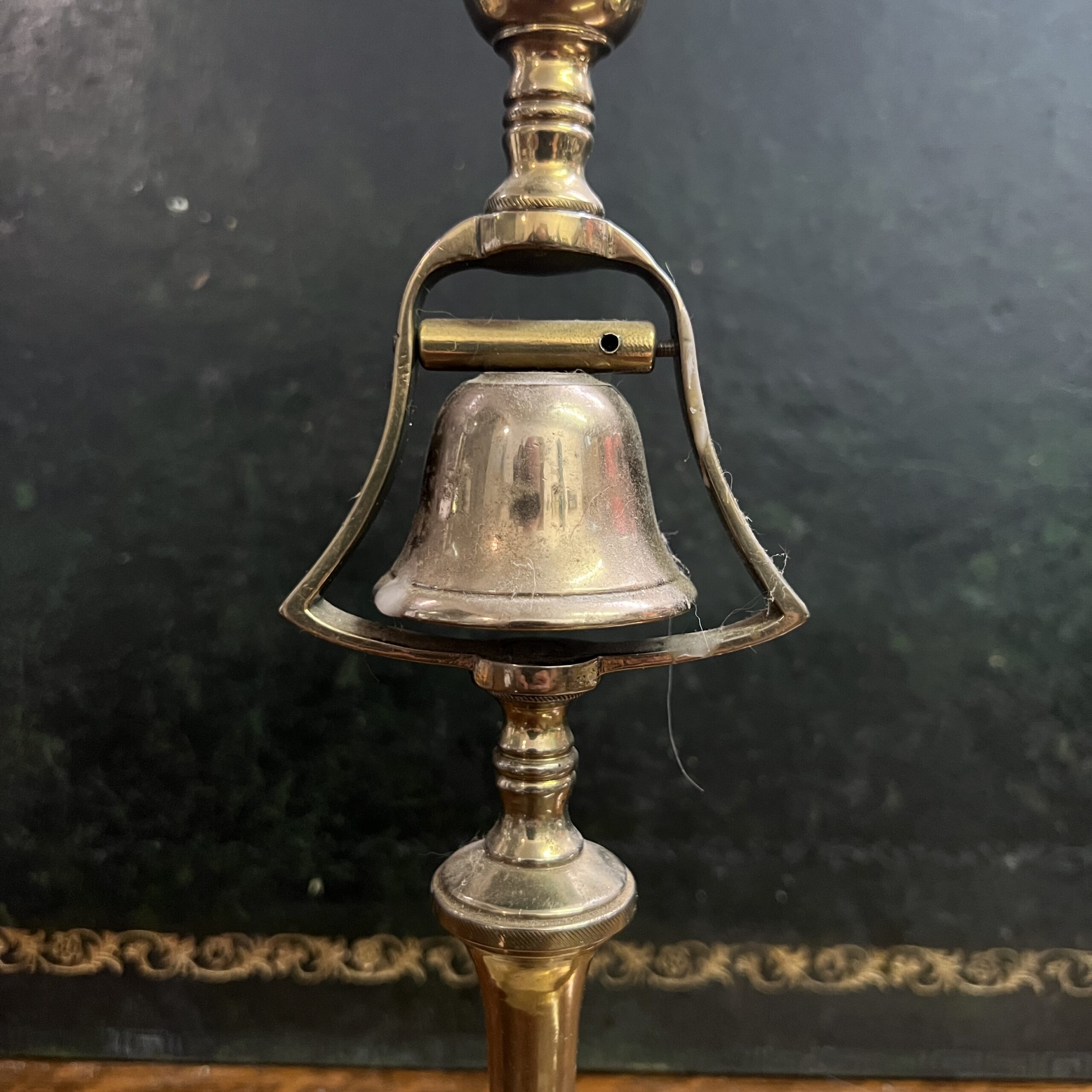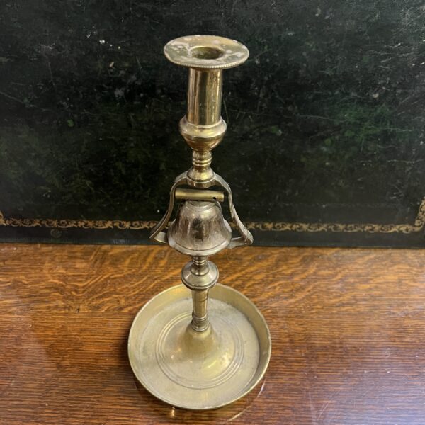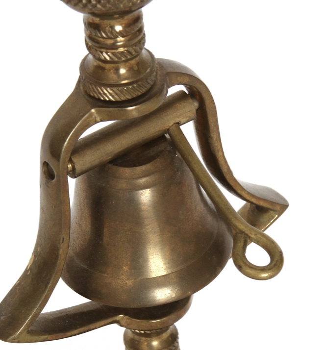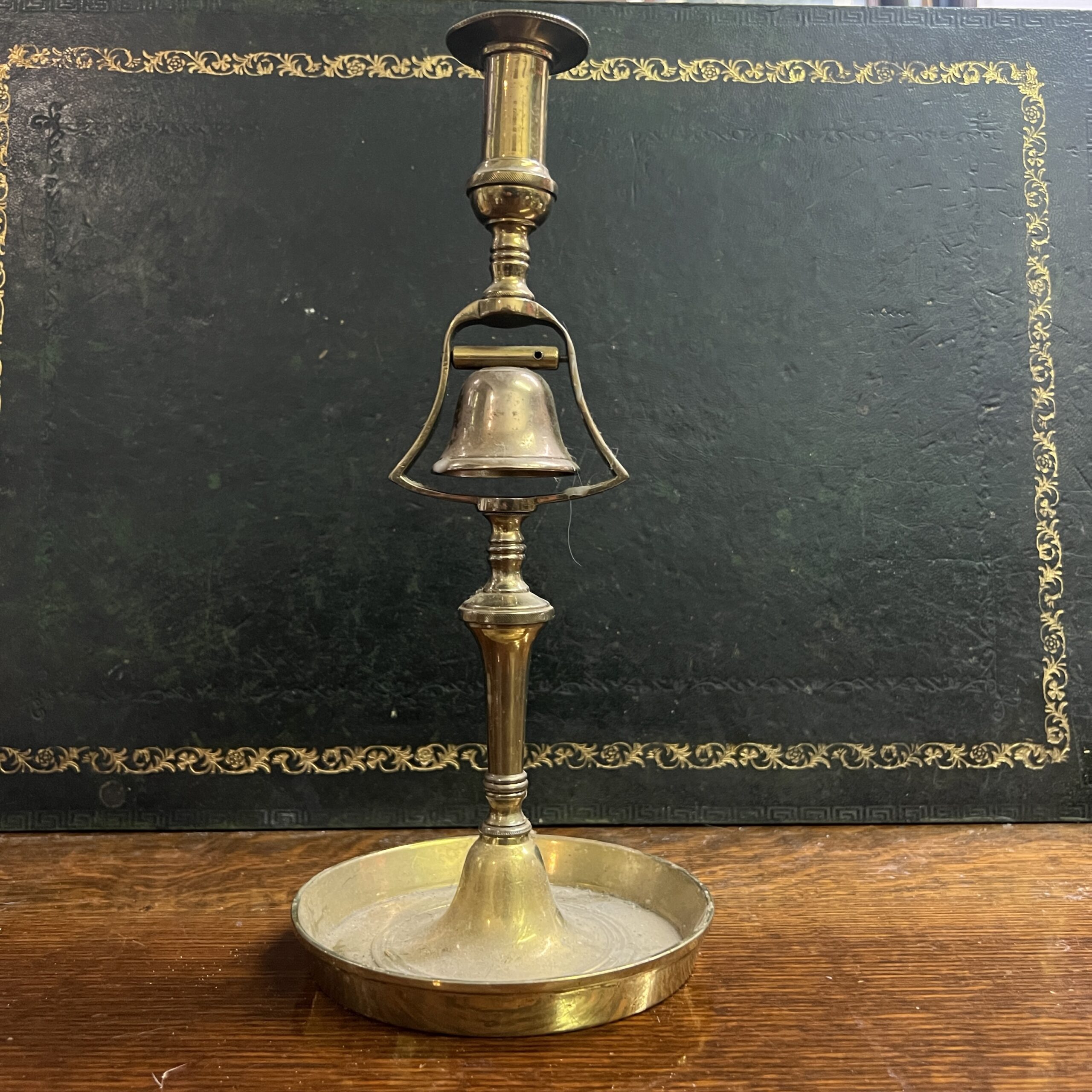 A brass tavern/hotel chamber candlestick with a bell for service/attention and wax drip catch tray. Made in India early 20th century. It is missing a small arm that would be pushed to ring the bell, see additional photo, and the bell is missing it’s striker ball.