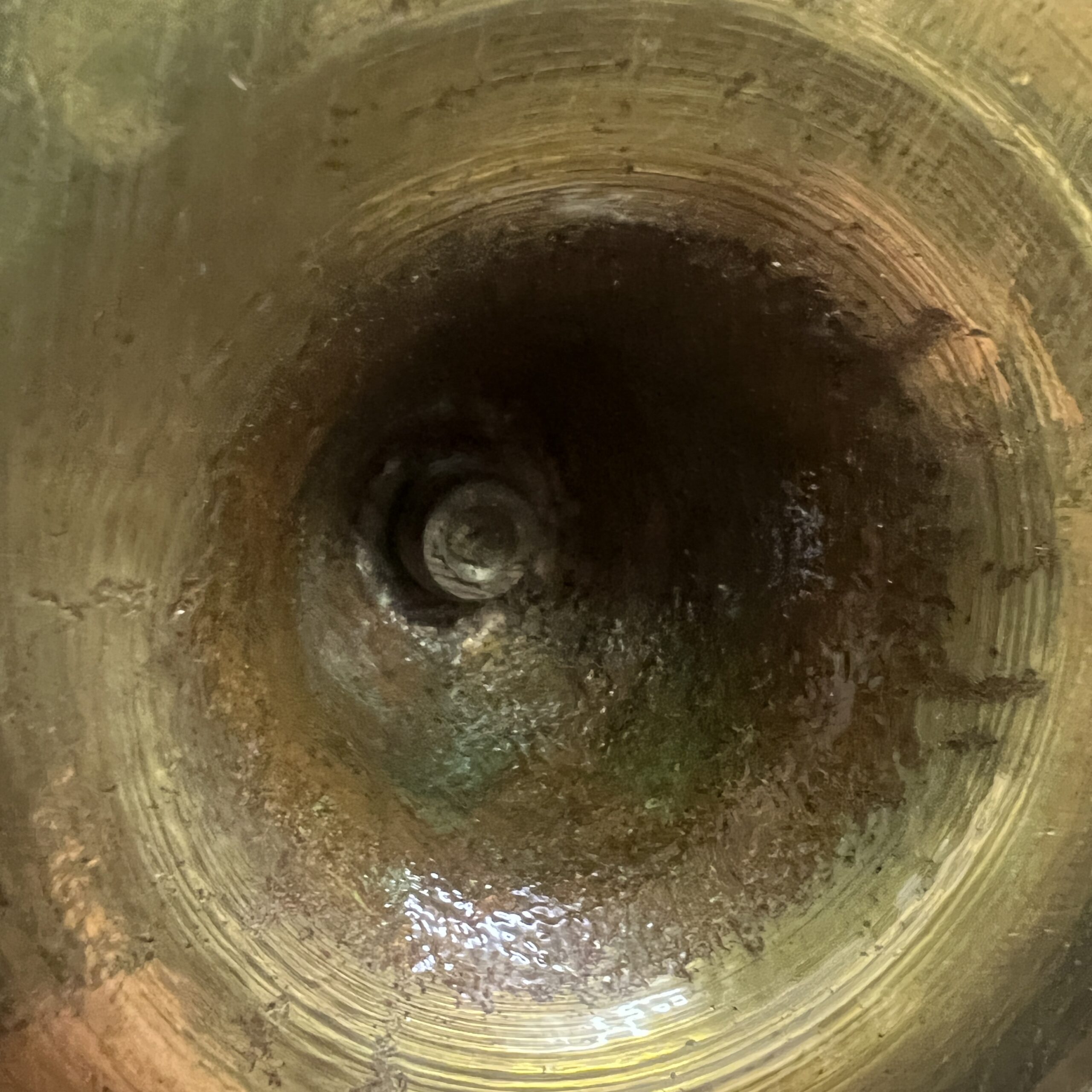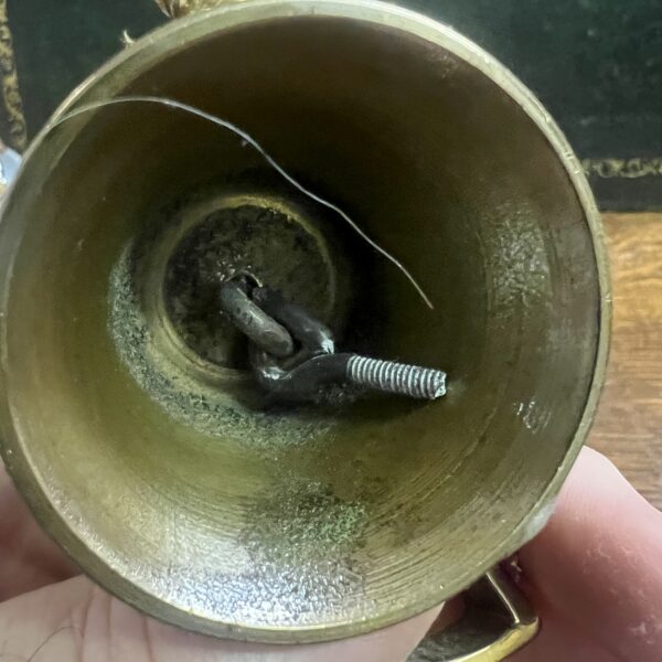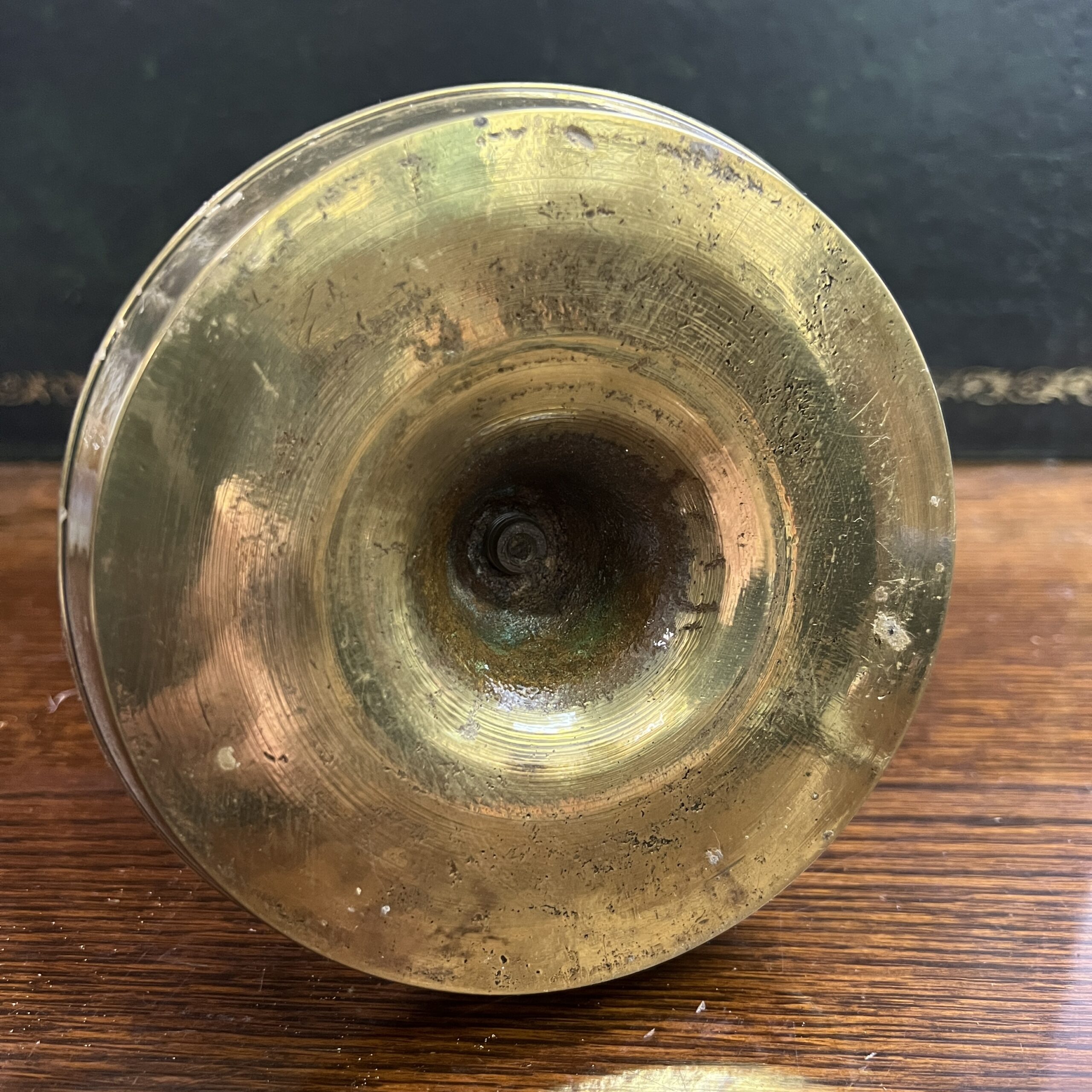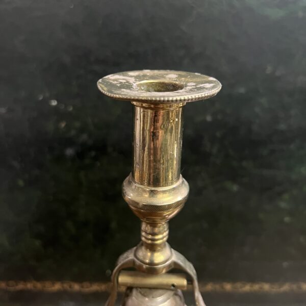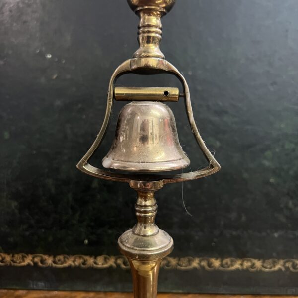 A brass tavern/hotel chamber candlestick with a bell for service/attention and wax drip catch tray. Made in India early 20th century. It is missing a small arm that would be pushed to ring the bell, see additional photo, and the bell is missing it’s striker ball.