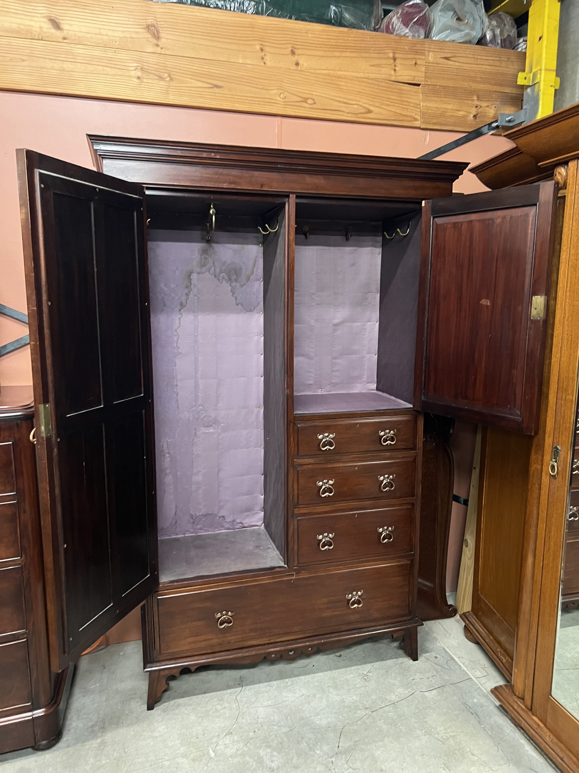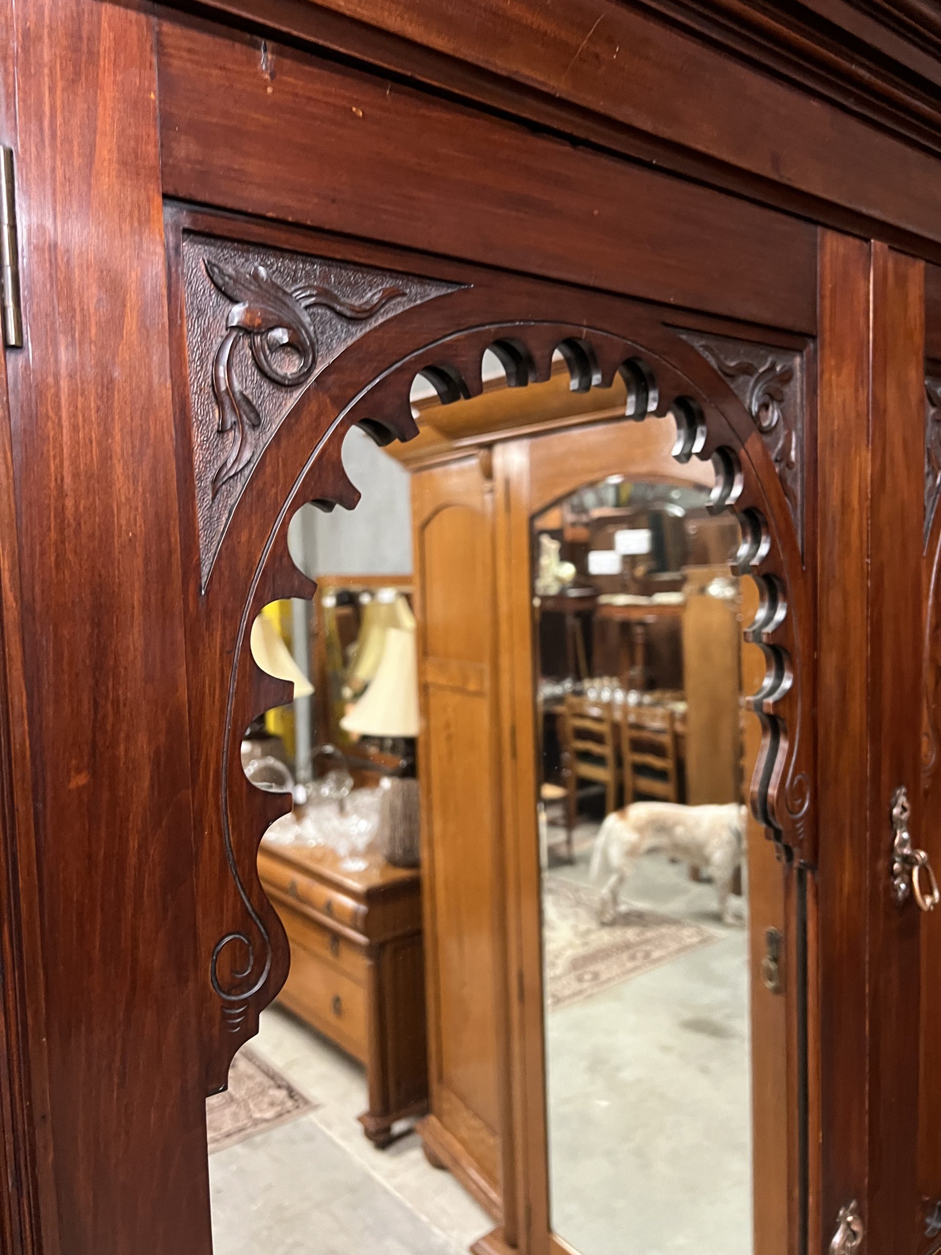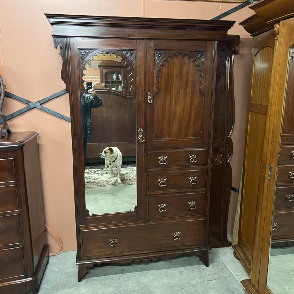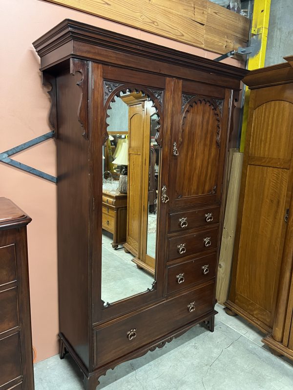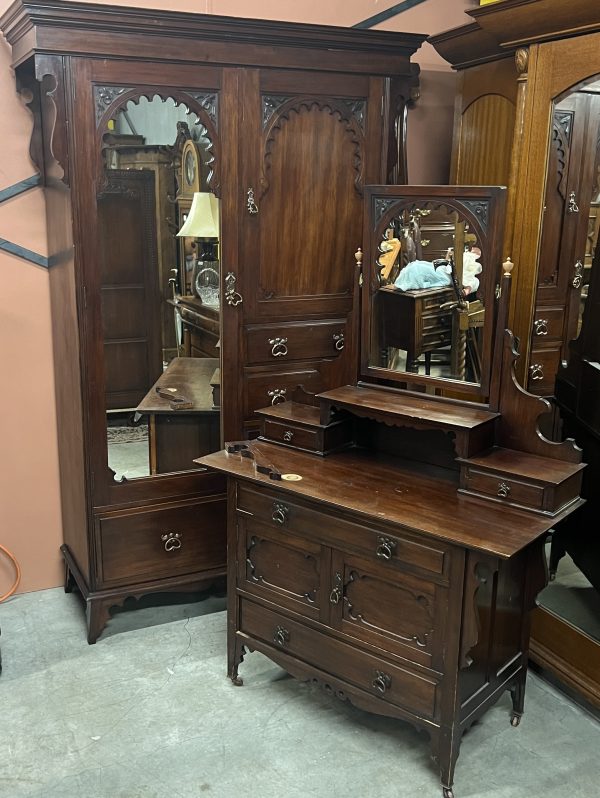 A Victorian combination wardrobe that has a mirrored door that encloses hanging space. The half door encloses space that was used for hats and bulky folded items. There is a bank of four drawers including a full width drawer at the bottom. It has decorative shaped brackets and a repeating semicircular carved arch detail at the top of each door. It has a shaped and pierced plinth that forms bracket feet, and a full set of decorative matching handles. There is a matching dressing table $1,195.00 search stock number 11916a
