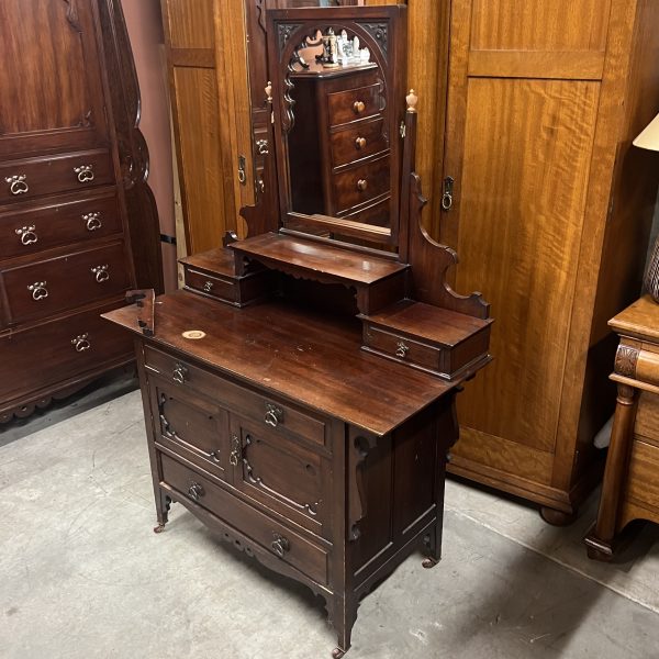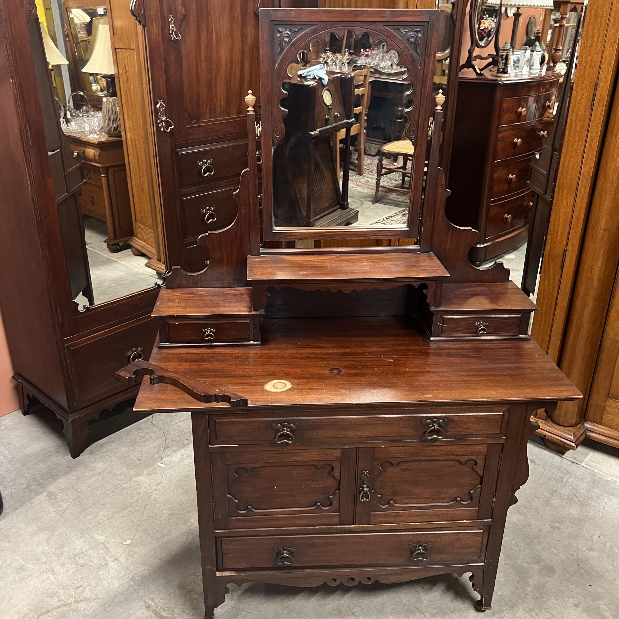 A Victorian dressing table that has a swing mirror on bracket supports each with a small jewellery drawer. The base has a top and lower full width drawers and a central two door cupboard. It has decorative shaped brackets and a repeating semicircular carved arch detail and finials at the top of the mirror. It has a shaped and pierced plinth that forms bracket feet, and a full set of decorative matching handles. Some restoration required. There is also a matching wardrobe $1,495.00 search stock number 11916