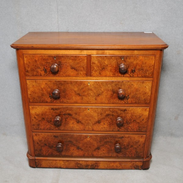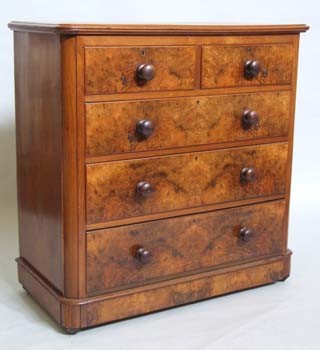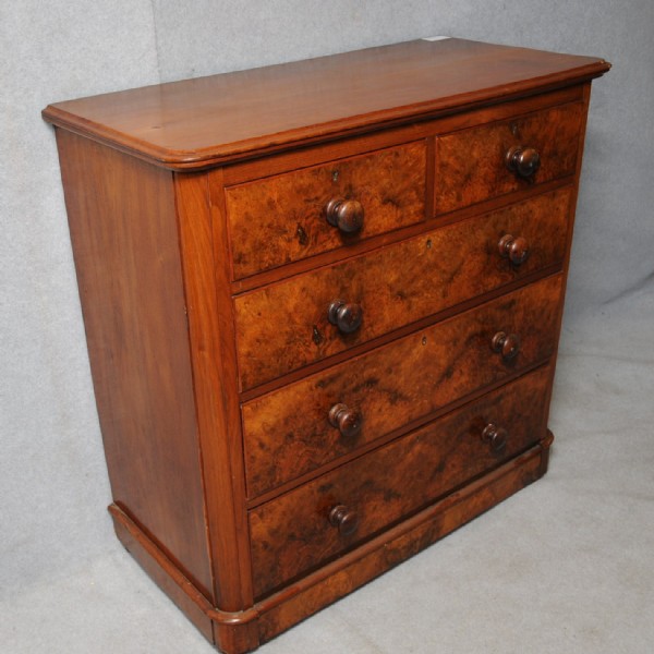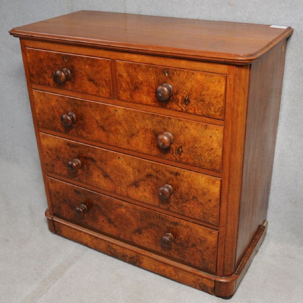 A Victorian figured walnut chest of drawers with rounded corners, it has two short and three long drawers, all drawers have turned knobs and are constructed with hand made dovetail joints. The chest stands on a plinth base. Size: 104 high x 103 wide x 50cm deep.