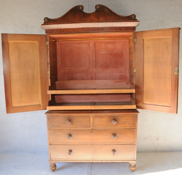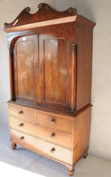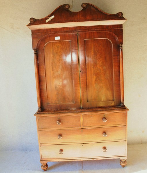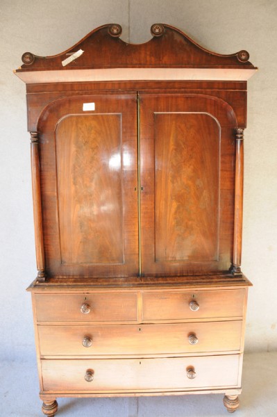 A Victorian mahogany linen press, with a shaped cornice over a pair of panelled doors and five drawers. Size: high x wide x cm deep.