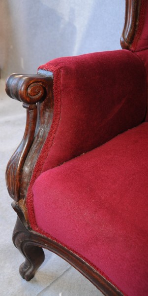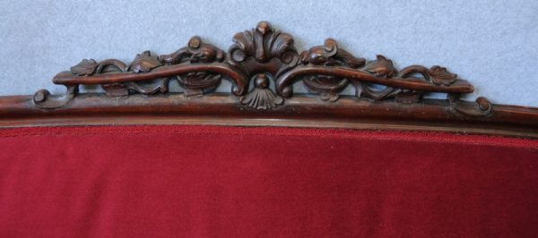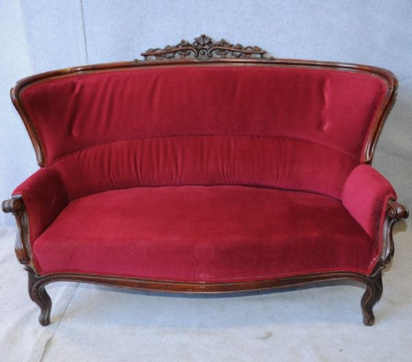 A Victorian mahogany settee, the high winged back terminates with an open fret carved crest over serpentine shaped seat.  The carved scroll arms over cabriole legs.
