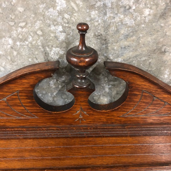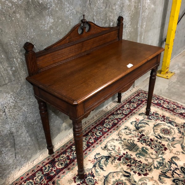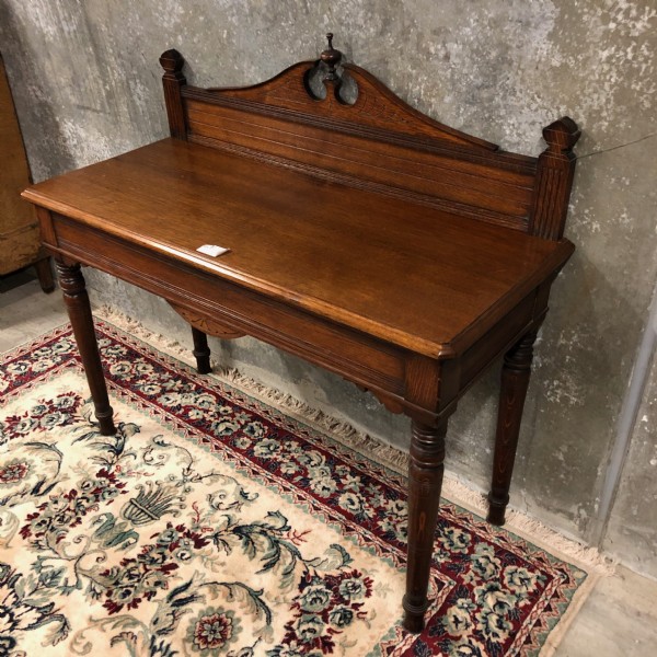 A Victorian oak side table raised on turned legs the back of the top having a decorative broken arch up-stand with central finial that is 1150mm high