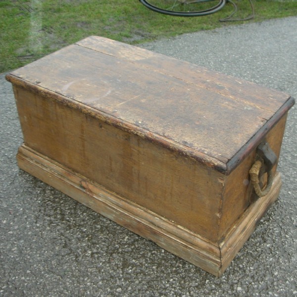 A Victorian pine ships chest with rope carry handles, hinged lid that encloses storage and candle box.