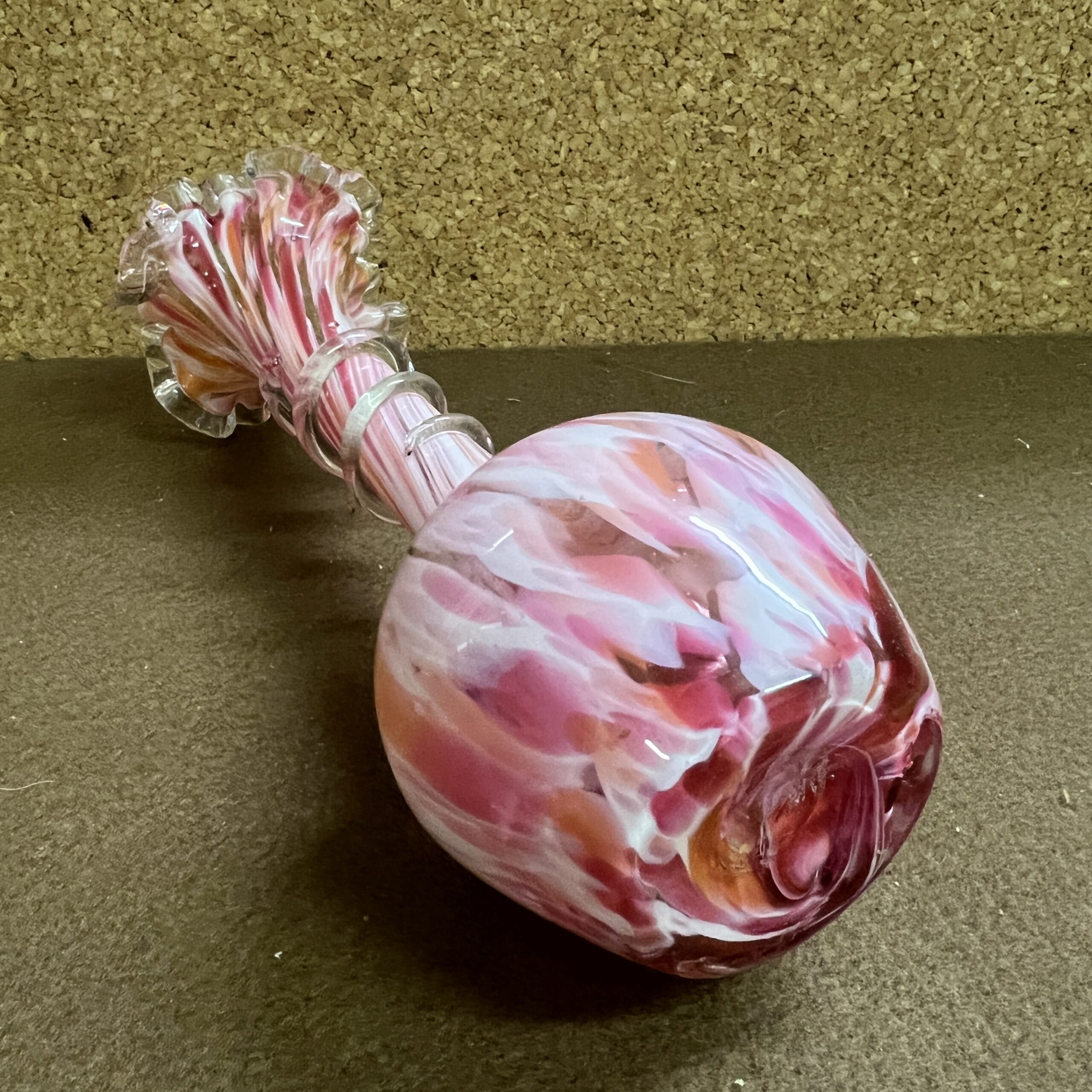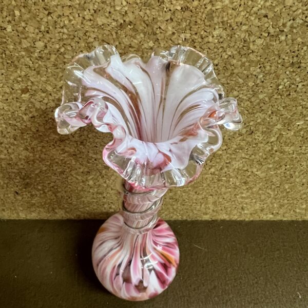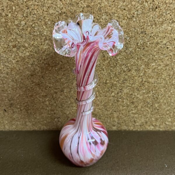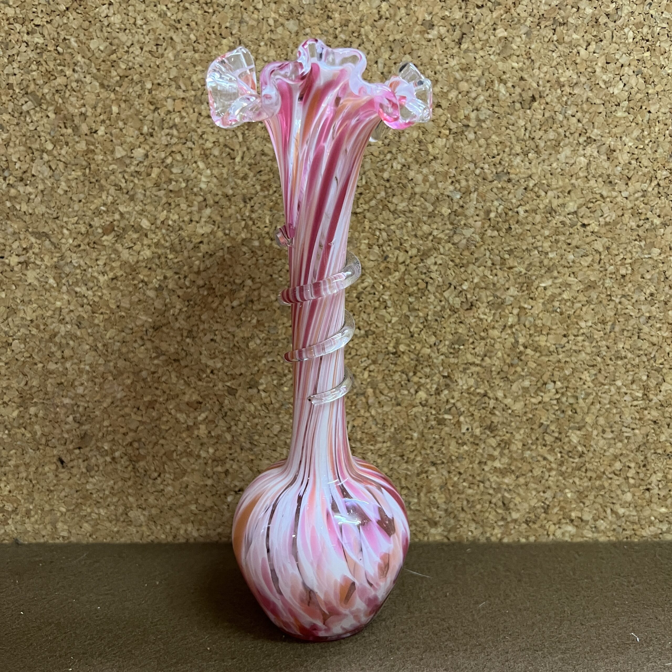 A Victorian long stem pink splatter glass vase with a frilled edge and applied spiral