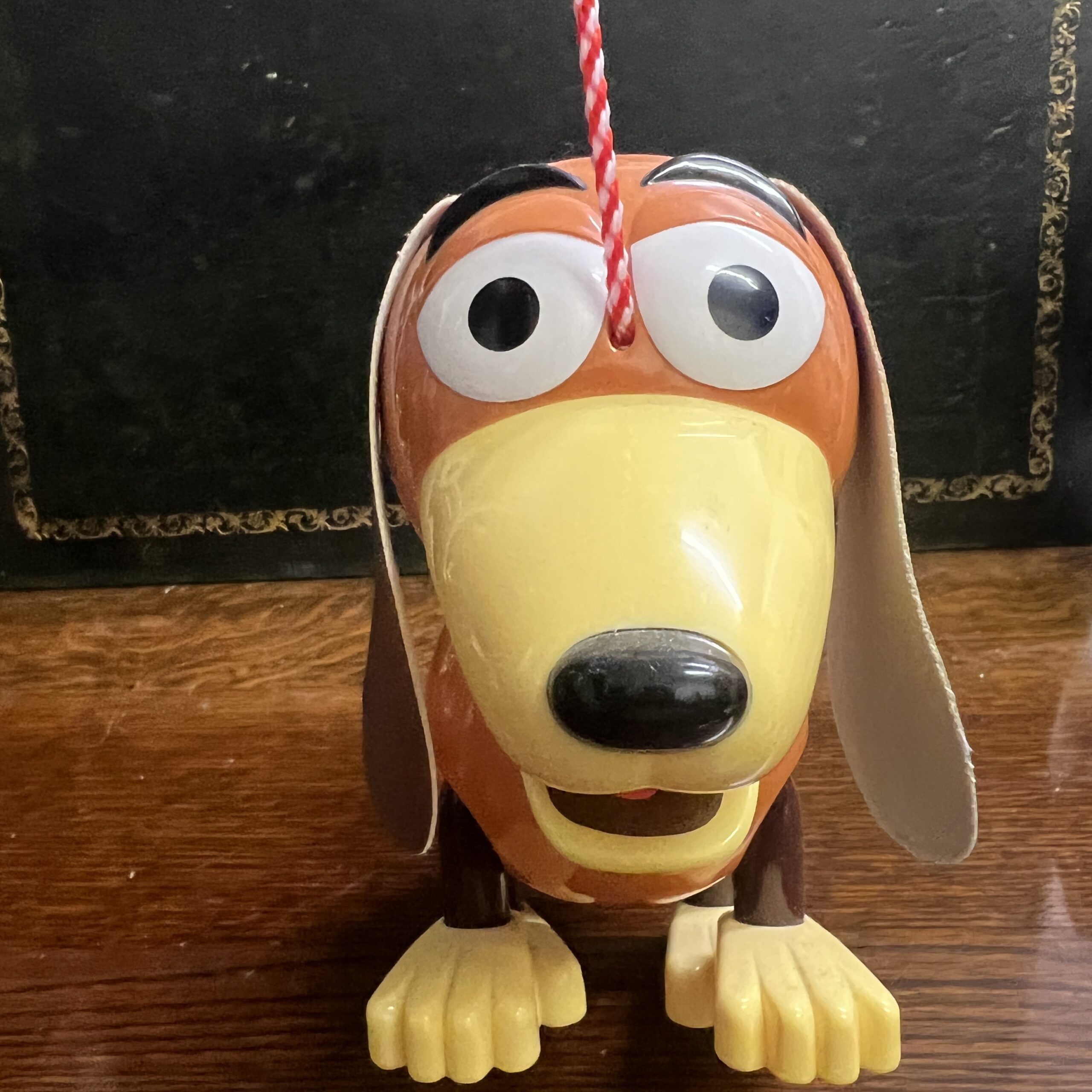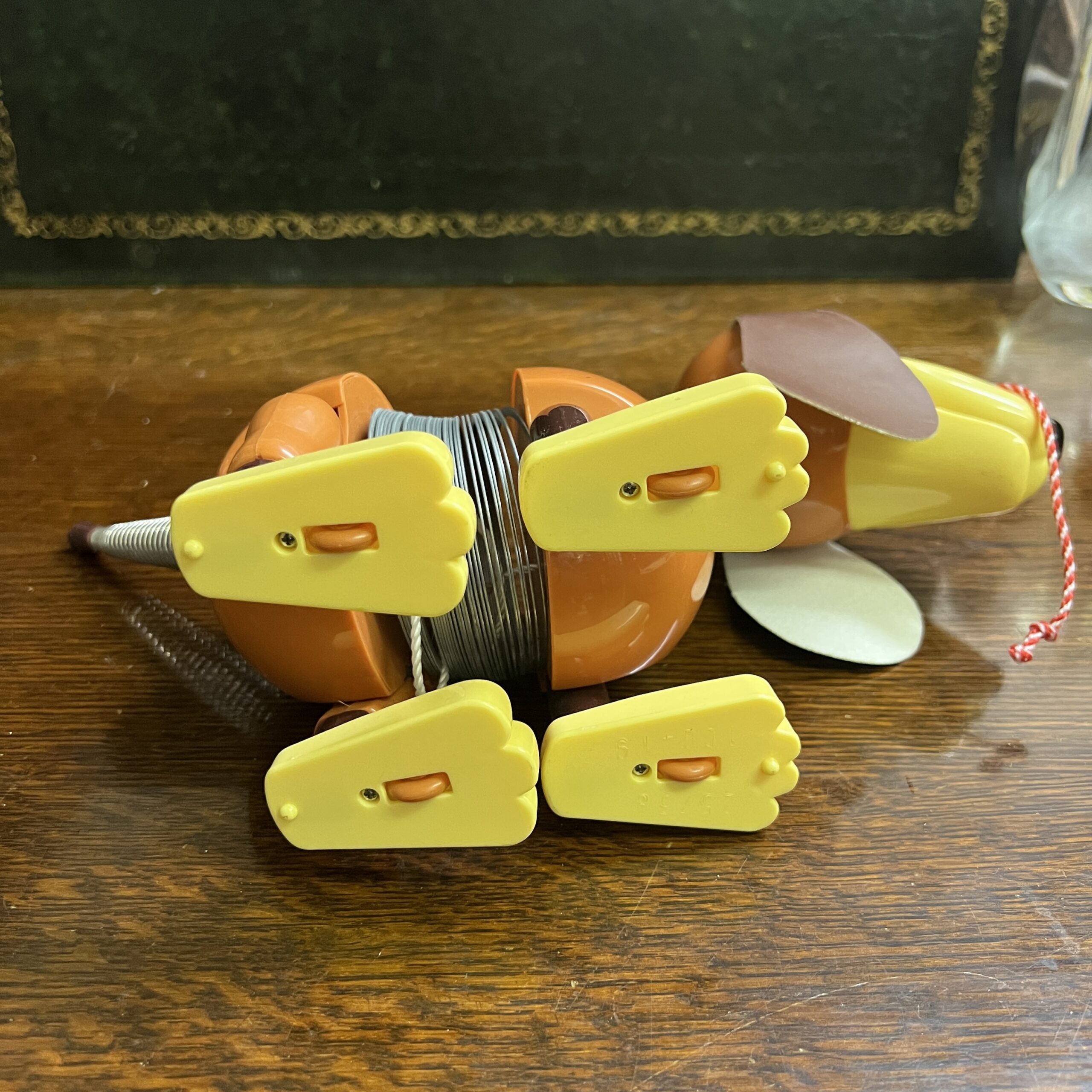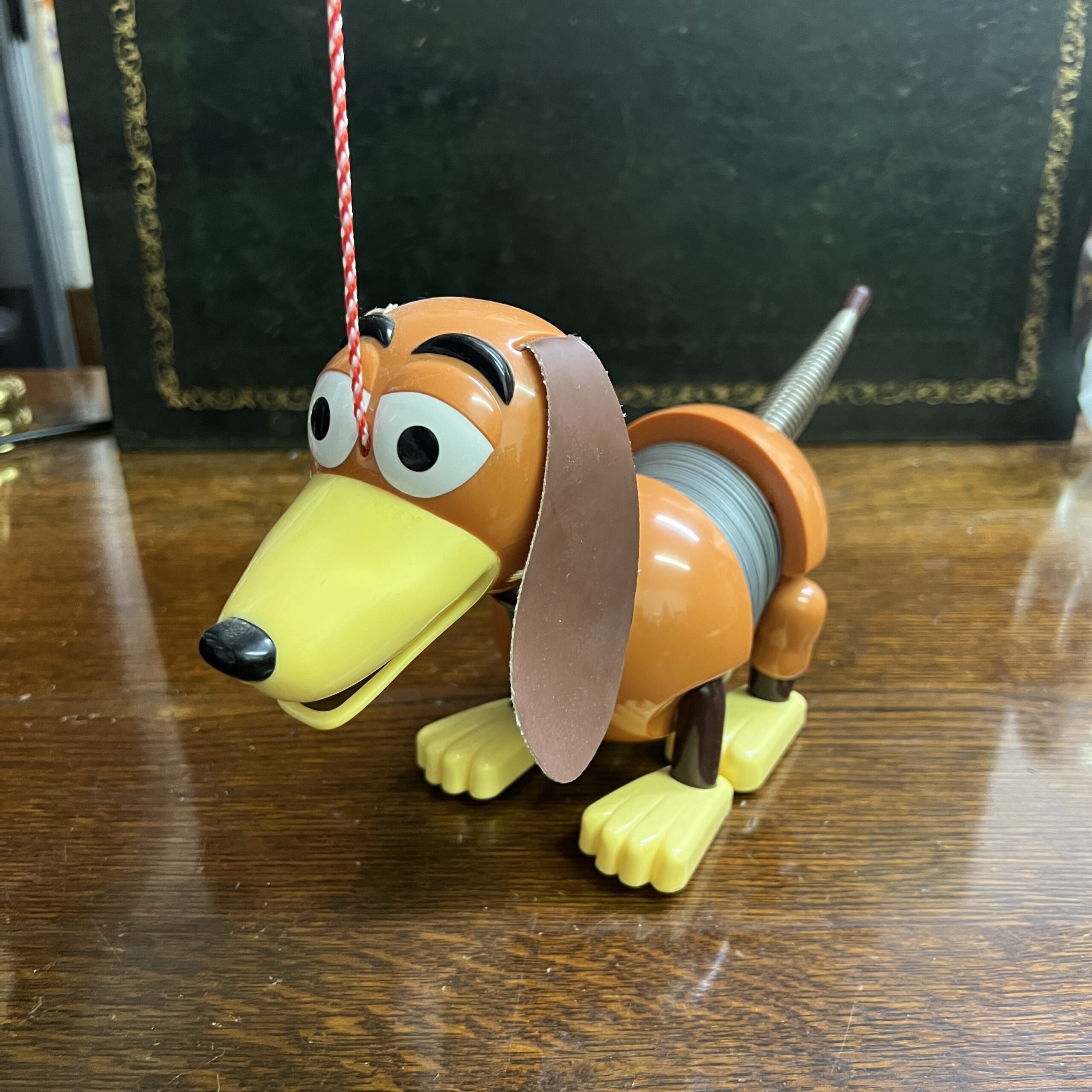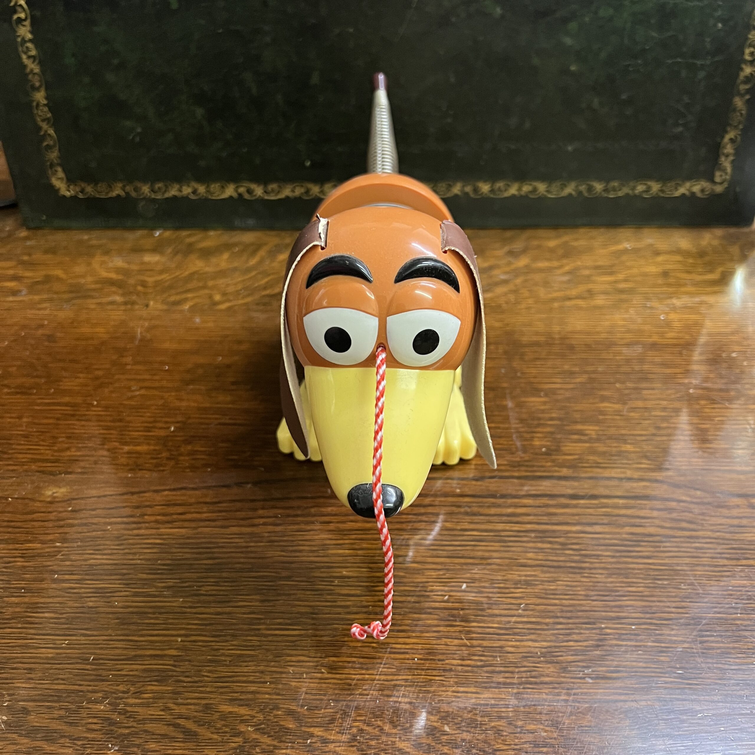 A vintage plastic pull along toy dachshund from Disney Pixar toy story