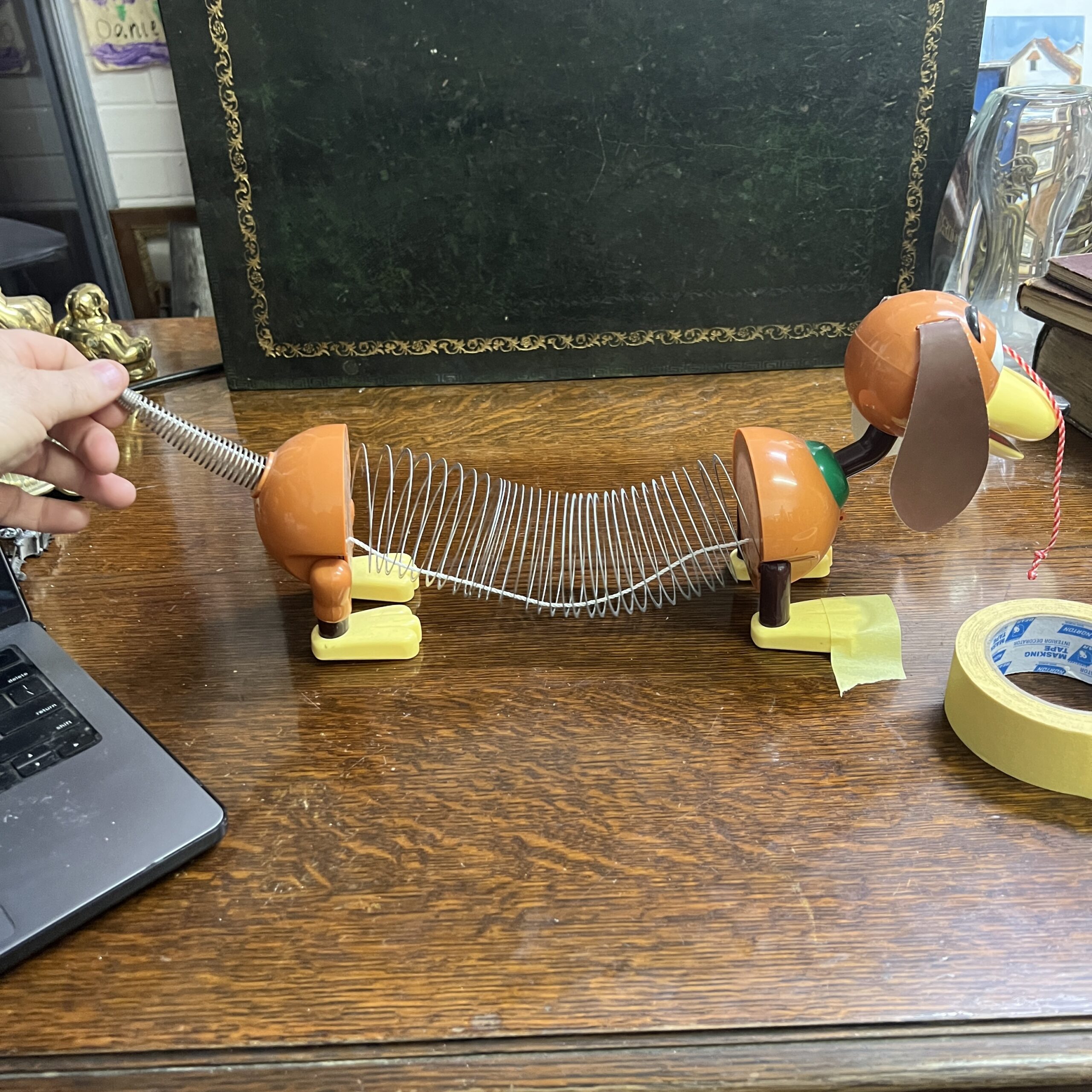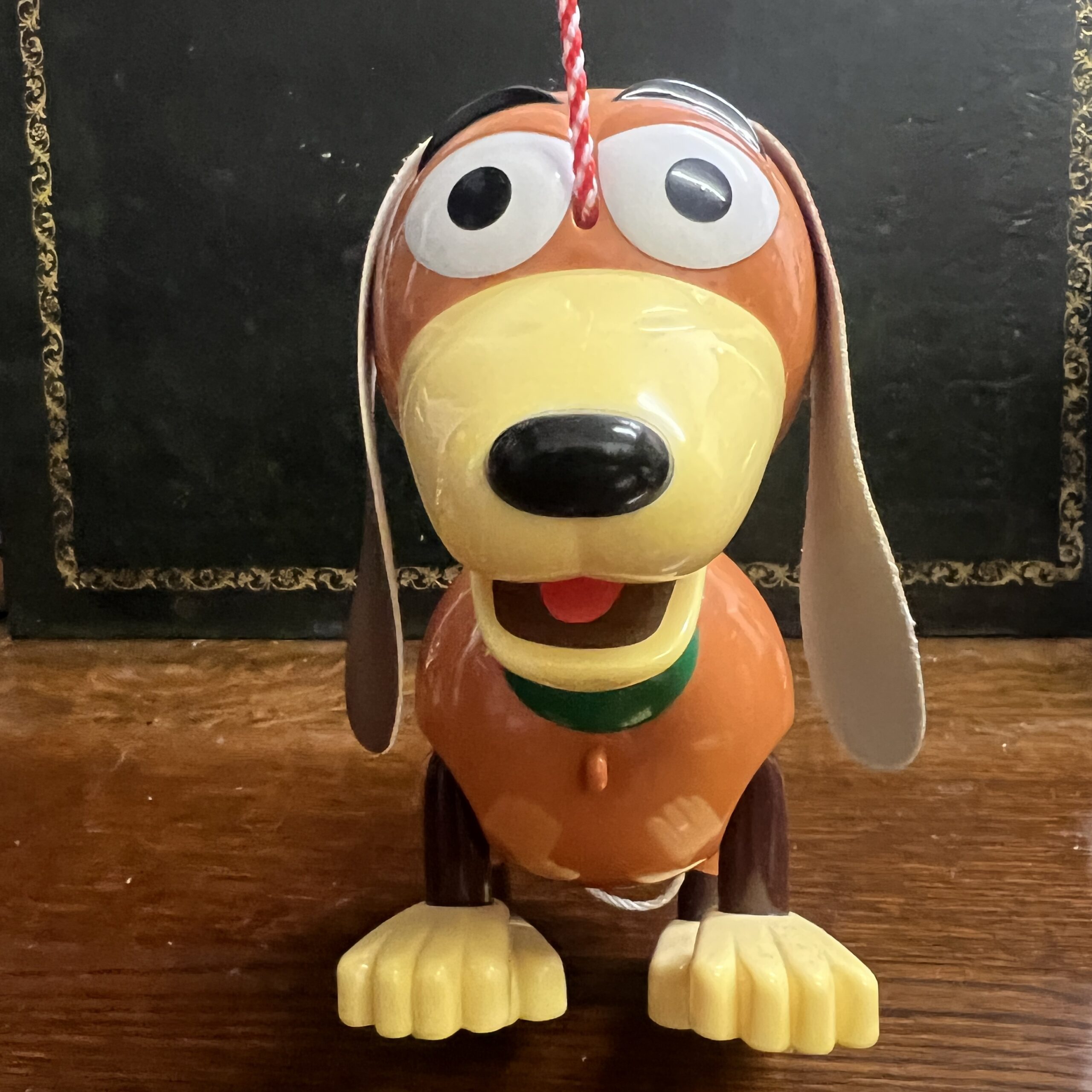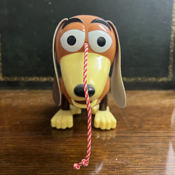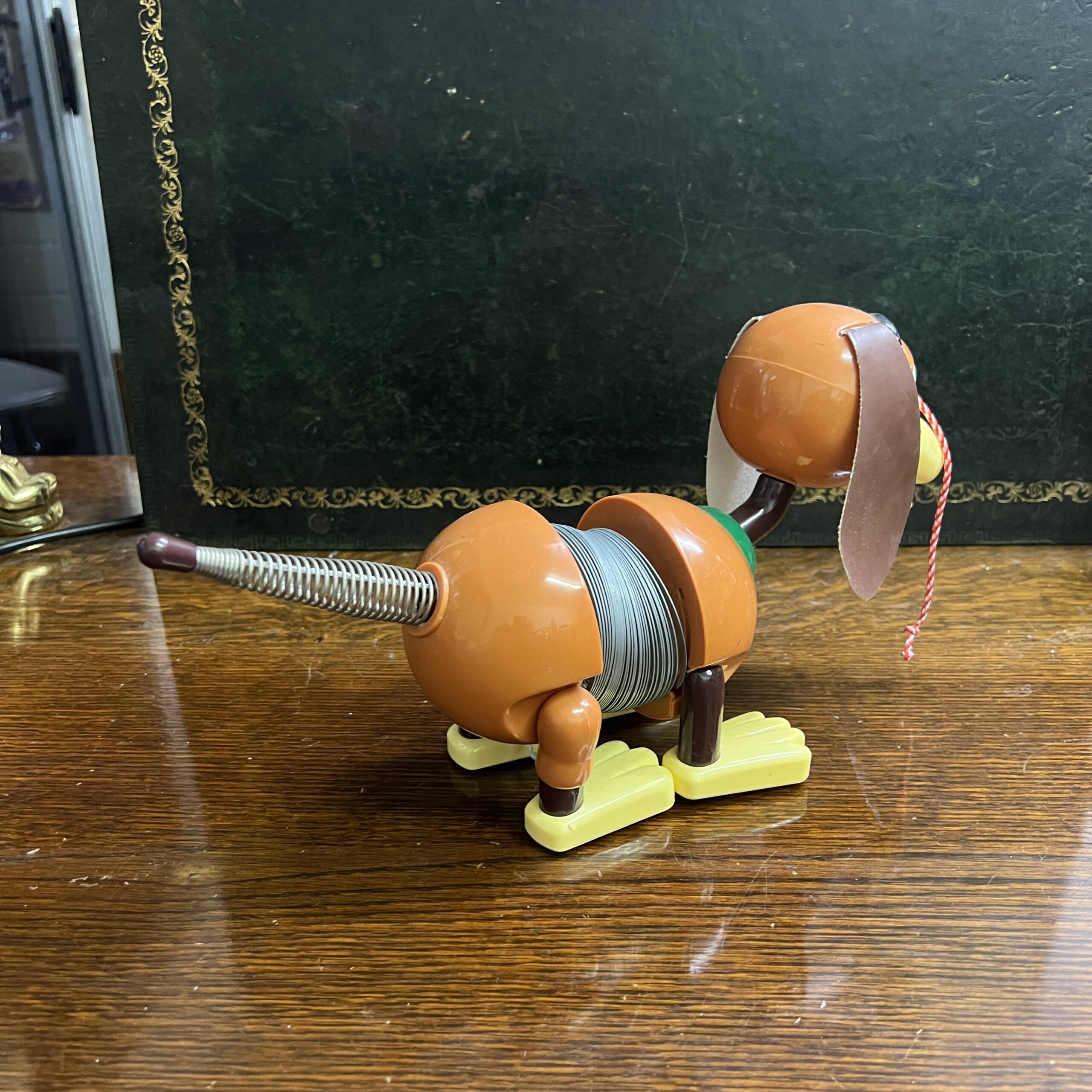 A vintage plastic pull along toy dachshund from Disney Pixar toy story