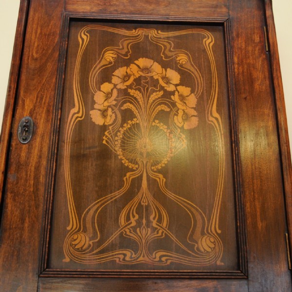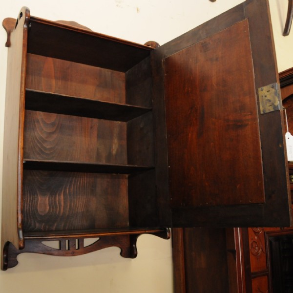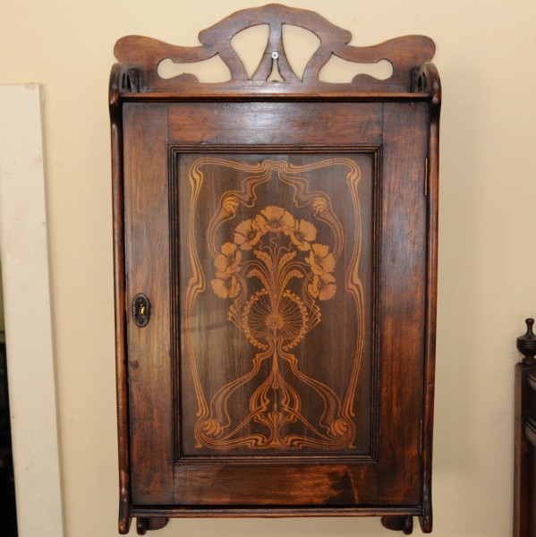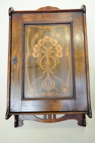 An Art Nouveau mahogany hanging wall cabinet the door decorated using pen work with floral Art Nouveau design. The top gallery and bottom shirt constructed with open fretwork design. The lockable door encloses two shelves.