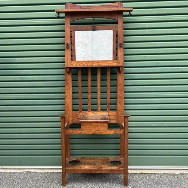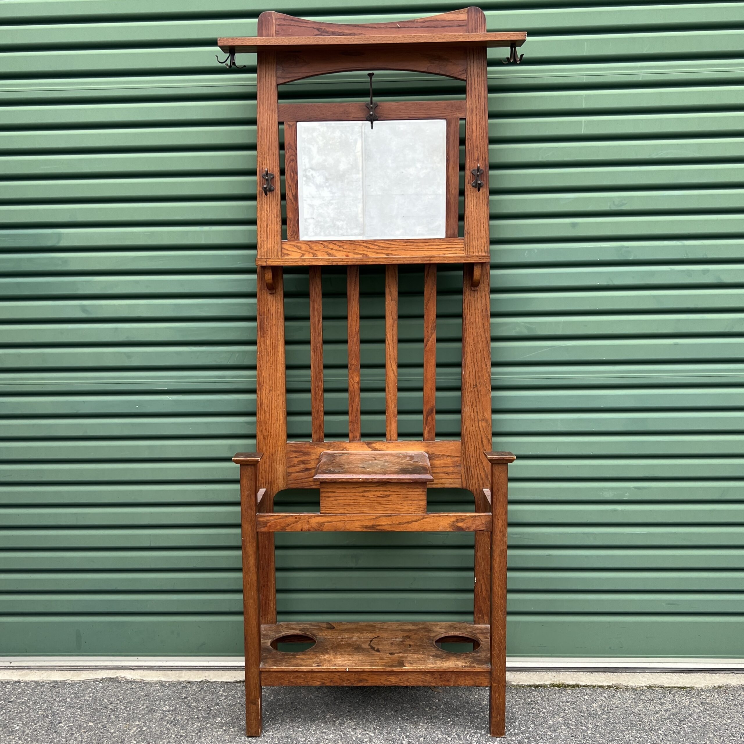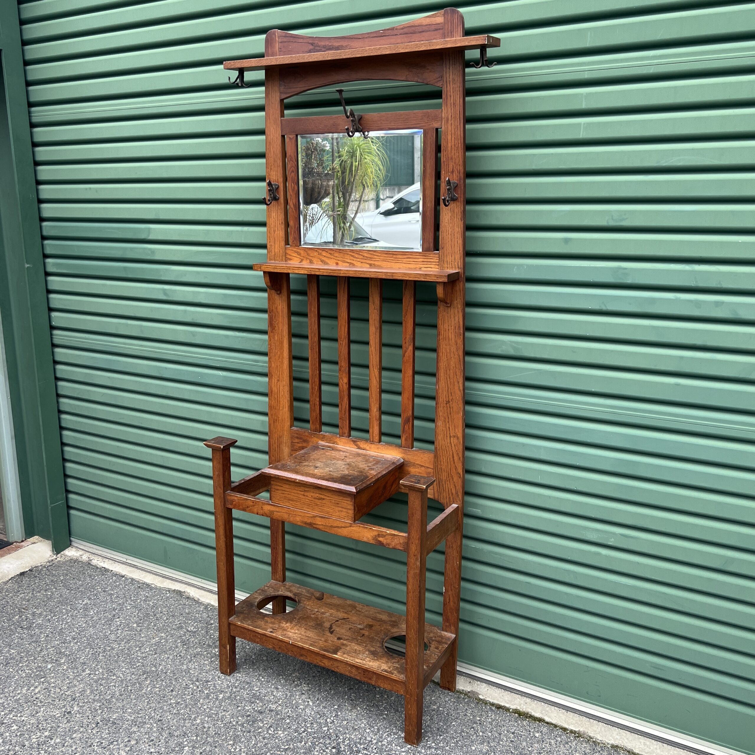 An Arts and crafts oak hallstand tapering in width from top to bottom with bevelled mirror above open slats and hinged glove box. It has capped square columns and bottom shelf with tin umbrella trays.