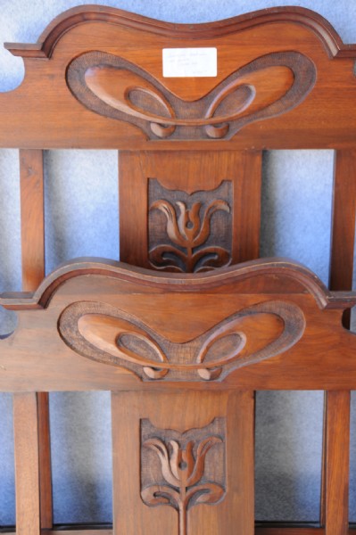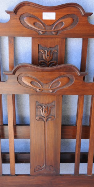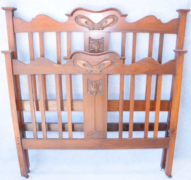 An Australian blackwood Art Nouveau double bed with stylized tulip carving to the centre panels.
