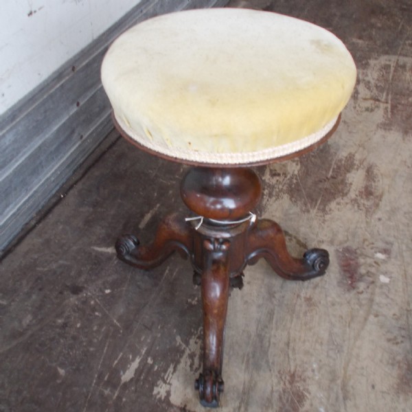 An early Victorian rosewood revolving piano stool with turned pedestal and tripod base with scrolling out swept legs on casters