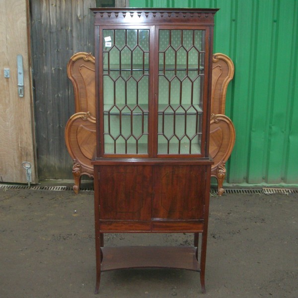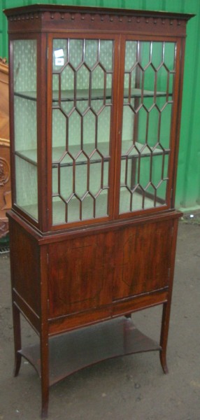 An Edwardian mahogany display cabinet with two astral glazed doors over two lower doors and shelf raised on out swept legs.