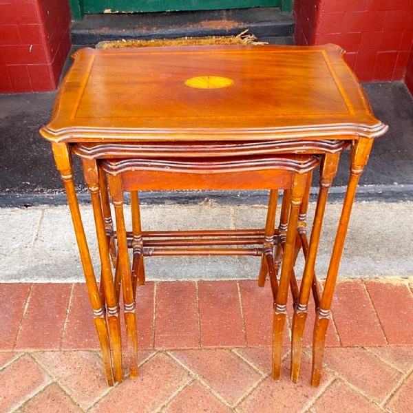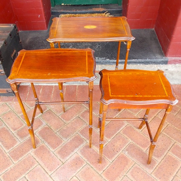 An Edwardian mahogany inlaid nest of three tables with shaped top raised on turned legs and stretchers.