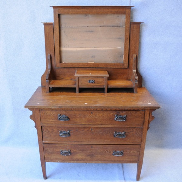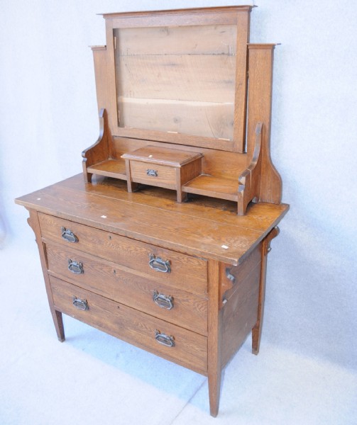 An Edwardian oak dressing chest with tilting bevelled mirror supported by shaped uprights, shelf and single drawer. The base raised on tapering square legs has three full width drawers that have decorative steel handles, all drawers are dovetail jointed. Mirror not shown in photo. Restored $1,295.00