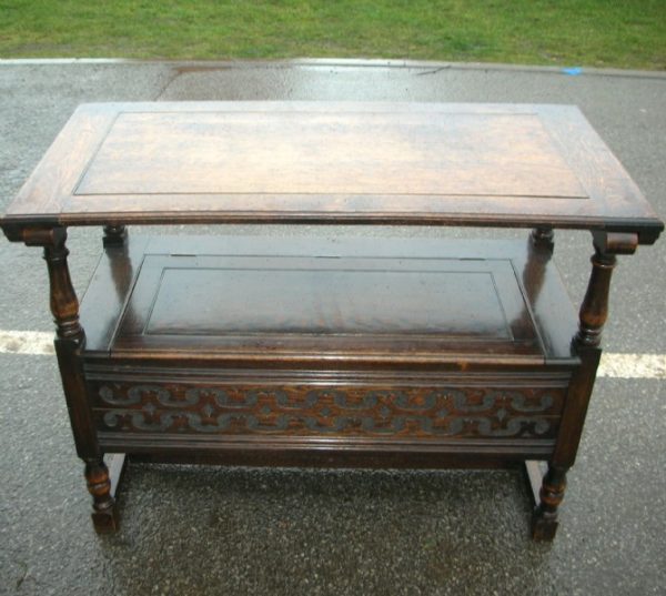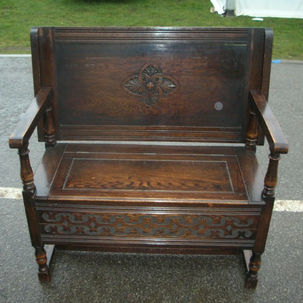 An Edwardian oak monks bench the back adjusts to become a table top. With a lift up seat for storage, turned legs and arm supports carved acanthus central medalian and blind fretwork decoration.