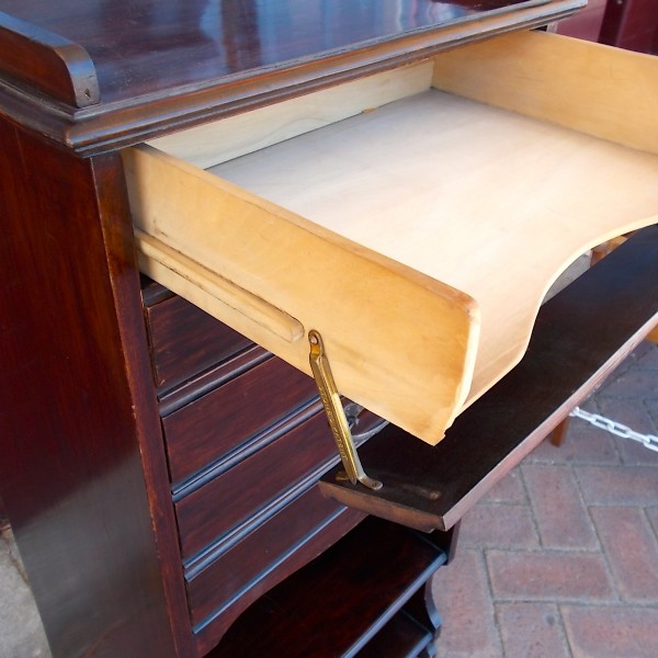 An Edwardian sheet music cabinet the gallery top over five drawers each with a mechanised drop down drawer front. there are two open lower shelves standing on shaped front feet. Could be used as a filing cabinet.