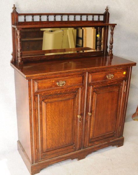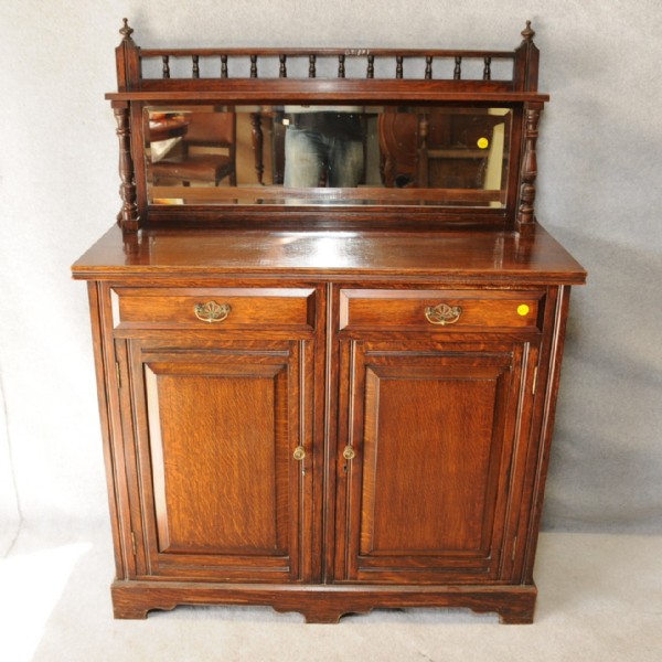 An oak chiffonier, the top section with bevelled mirror and spindle turned gallery rail above small shelf with turned supports. The base with two drawers and two panelled doors. Size: 143 high x 108 wide x 46cm deep.