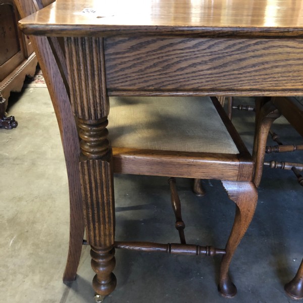 An early 20th century American oak extendable dining table with three removable leaves and six high back oak dining chairs with cabriole legs