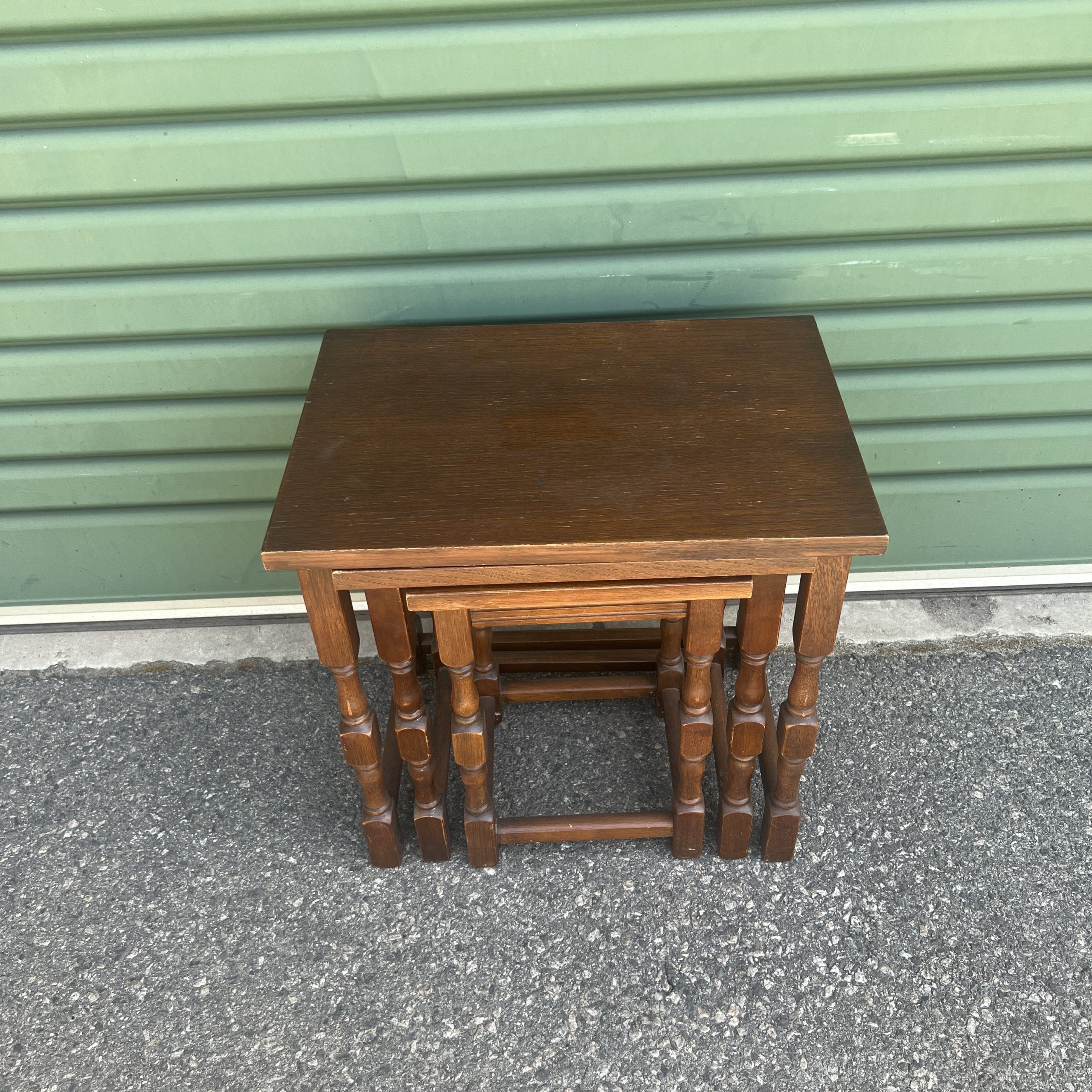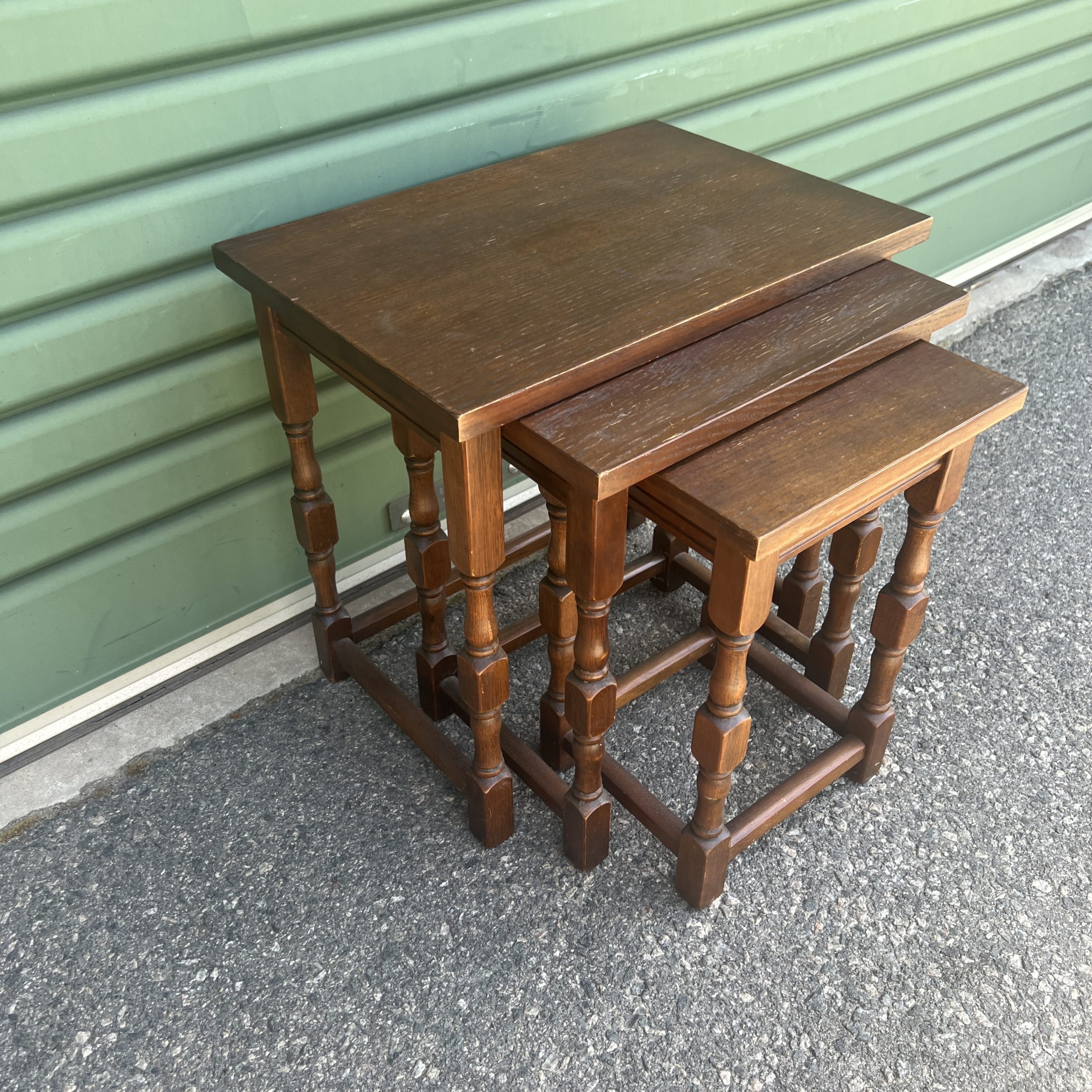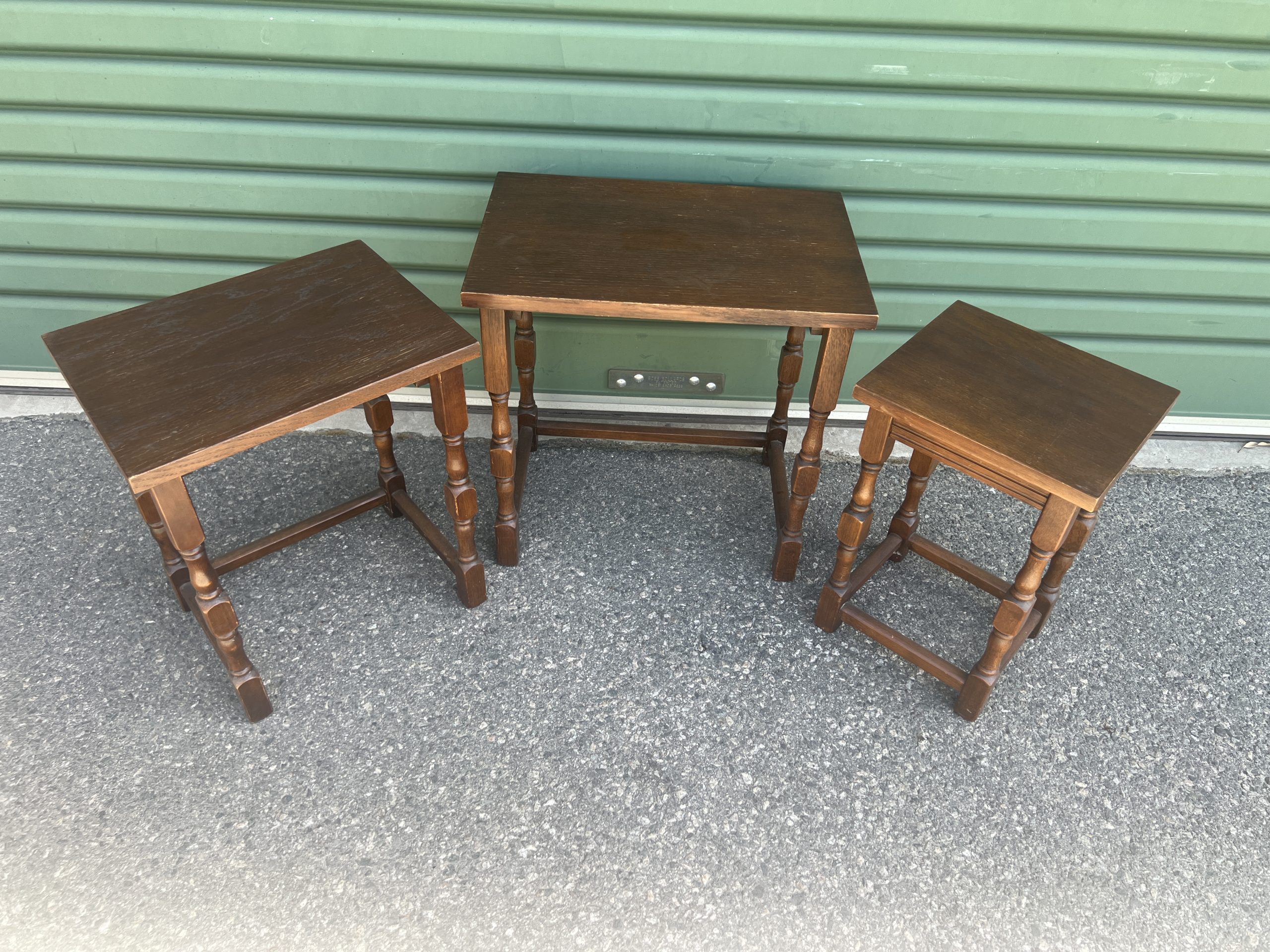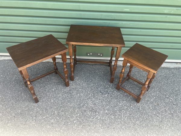 An oak nest of three tables each graduating down in size with turned legs $595 restored