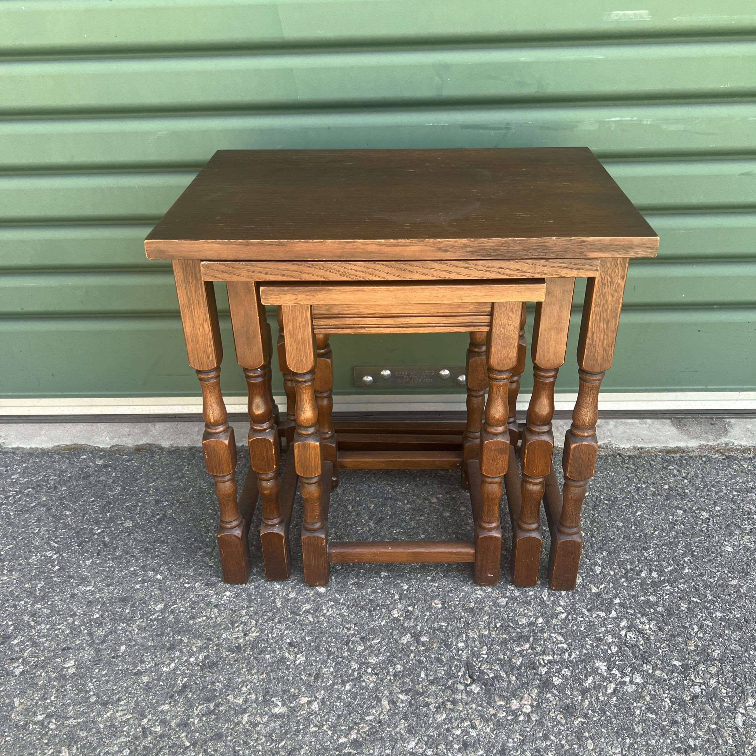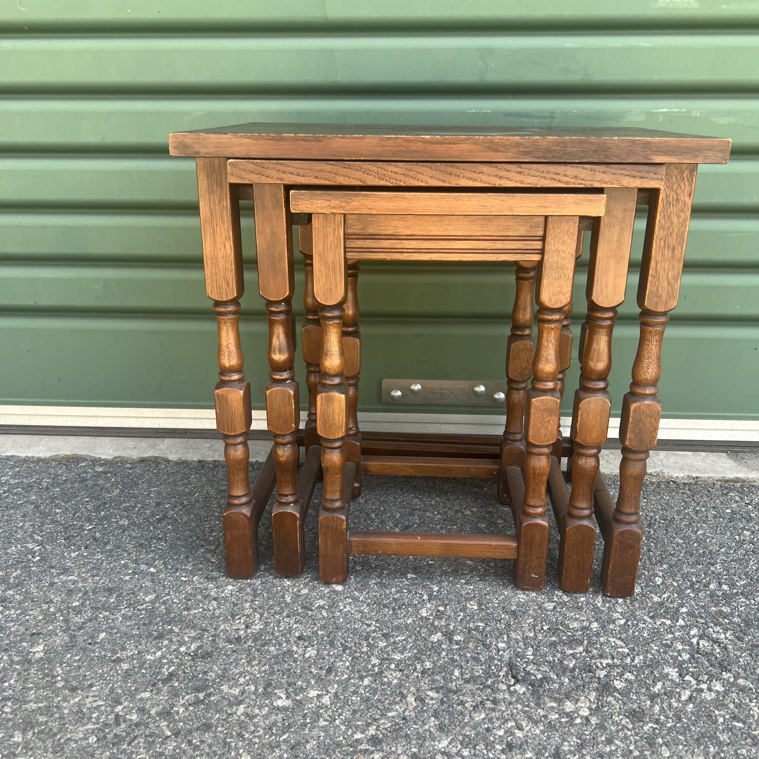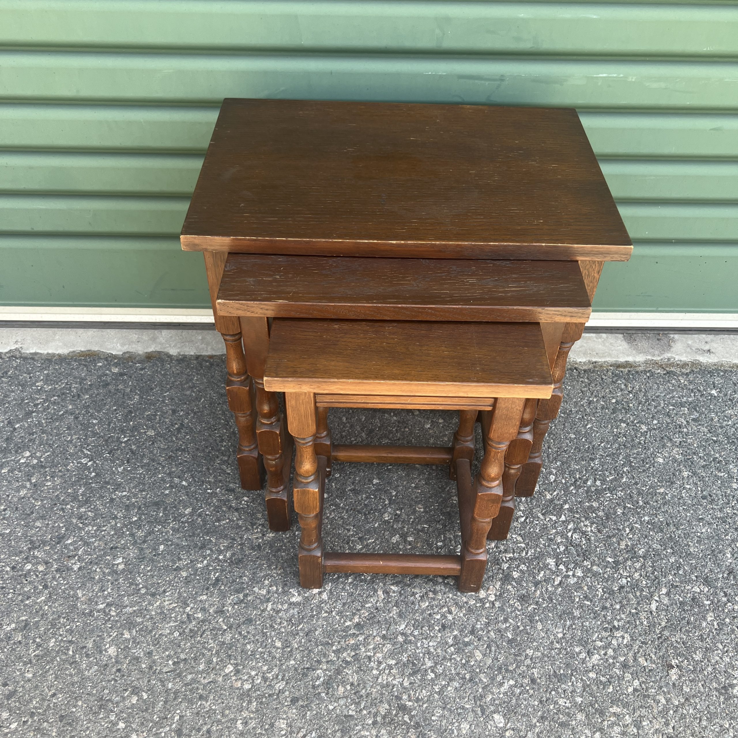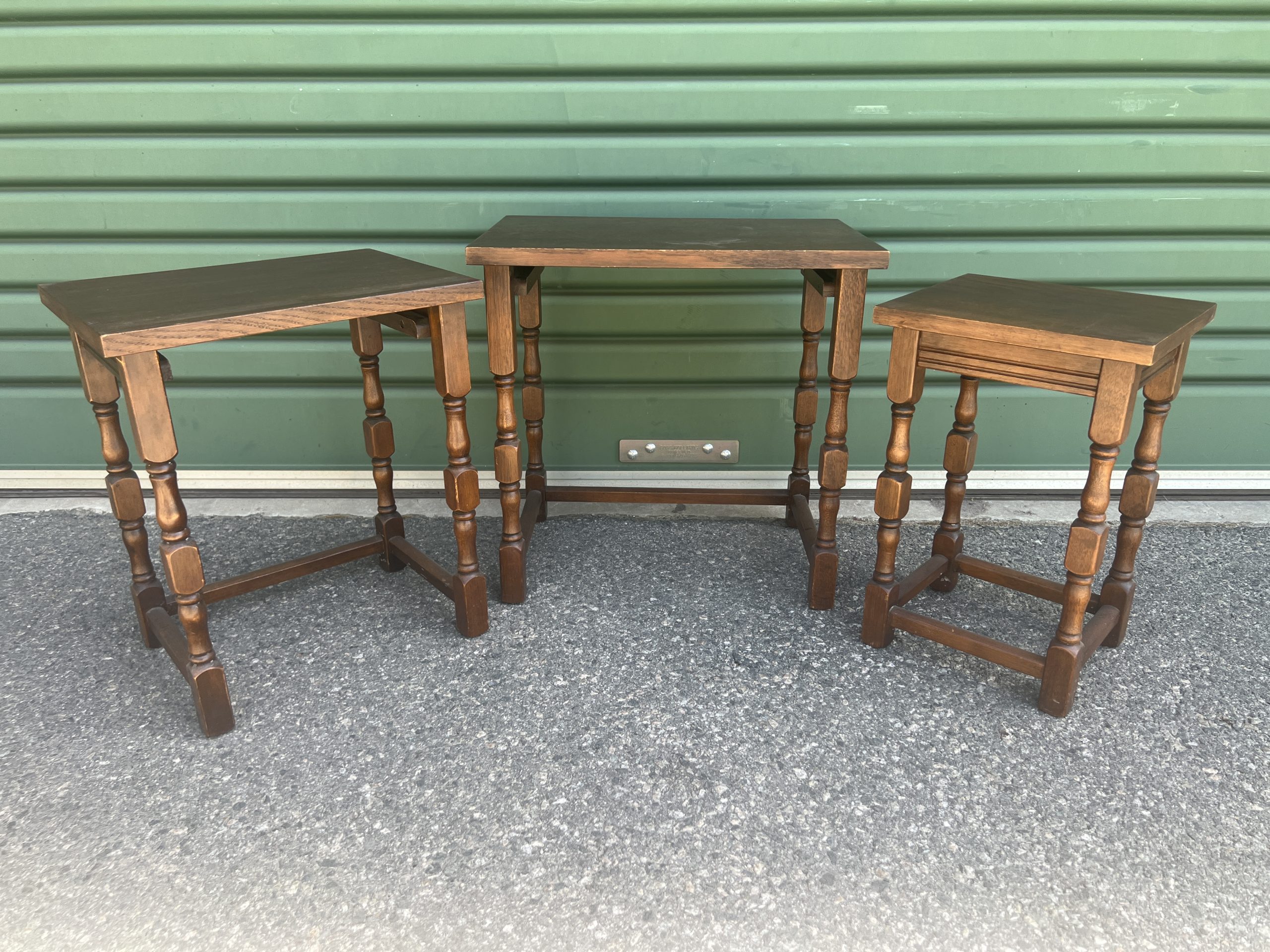 An oak nest of three tables each graduating down in size with turned legs $595 restored