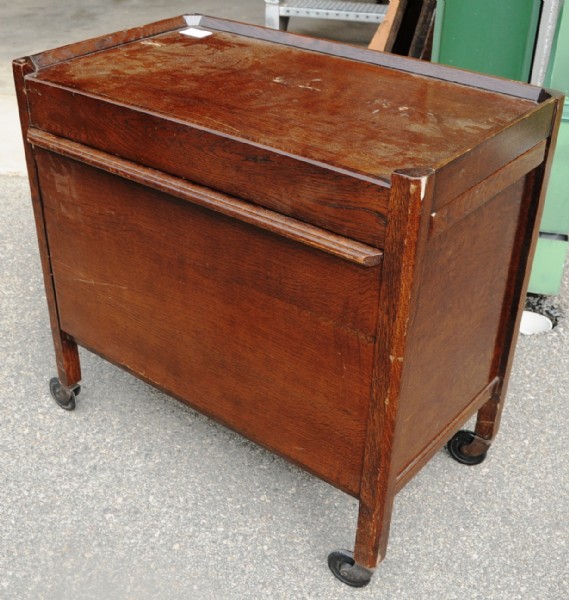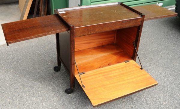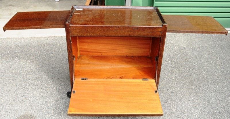 An oak tea trolley/cocktail cabinet.