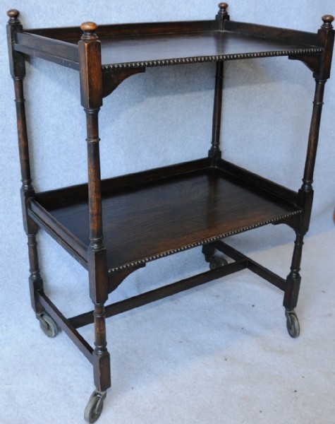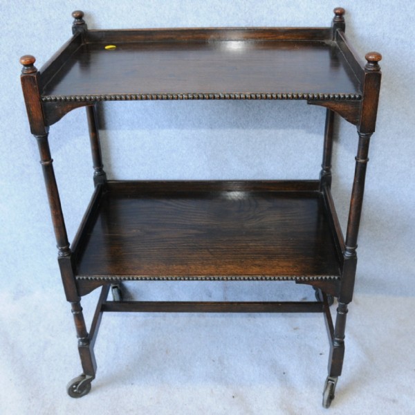 An oak two tier tea trolley with beaded edges, the four turned legs terminate with turned finials and raised on castors. Size: 82 high x 61 wide x 38cm deep.