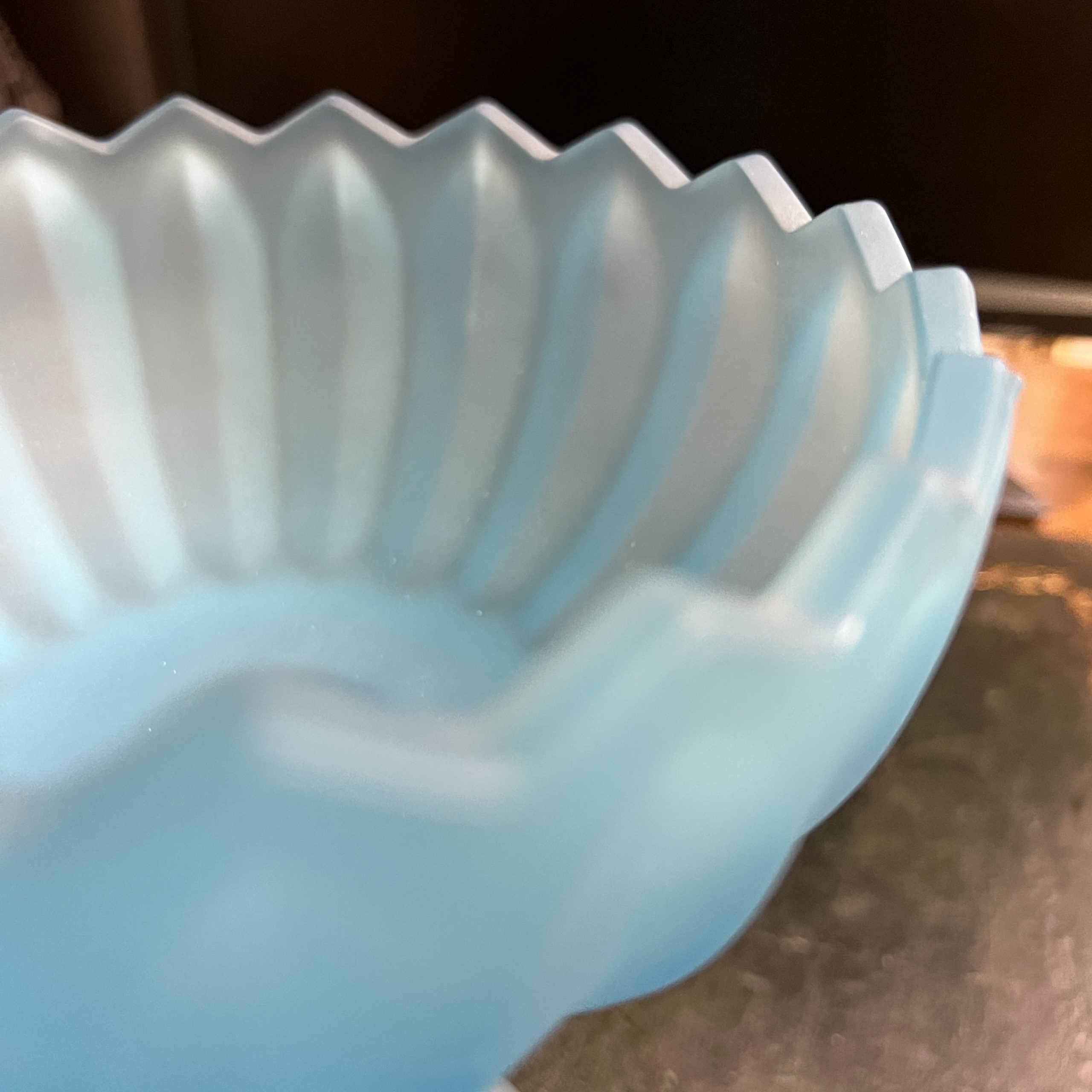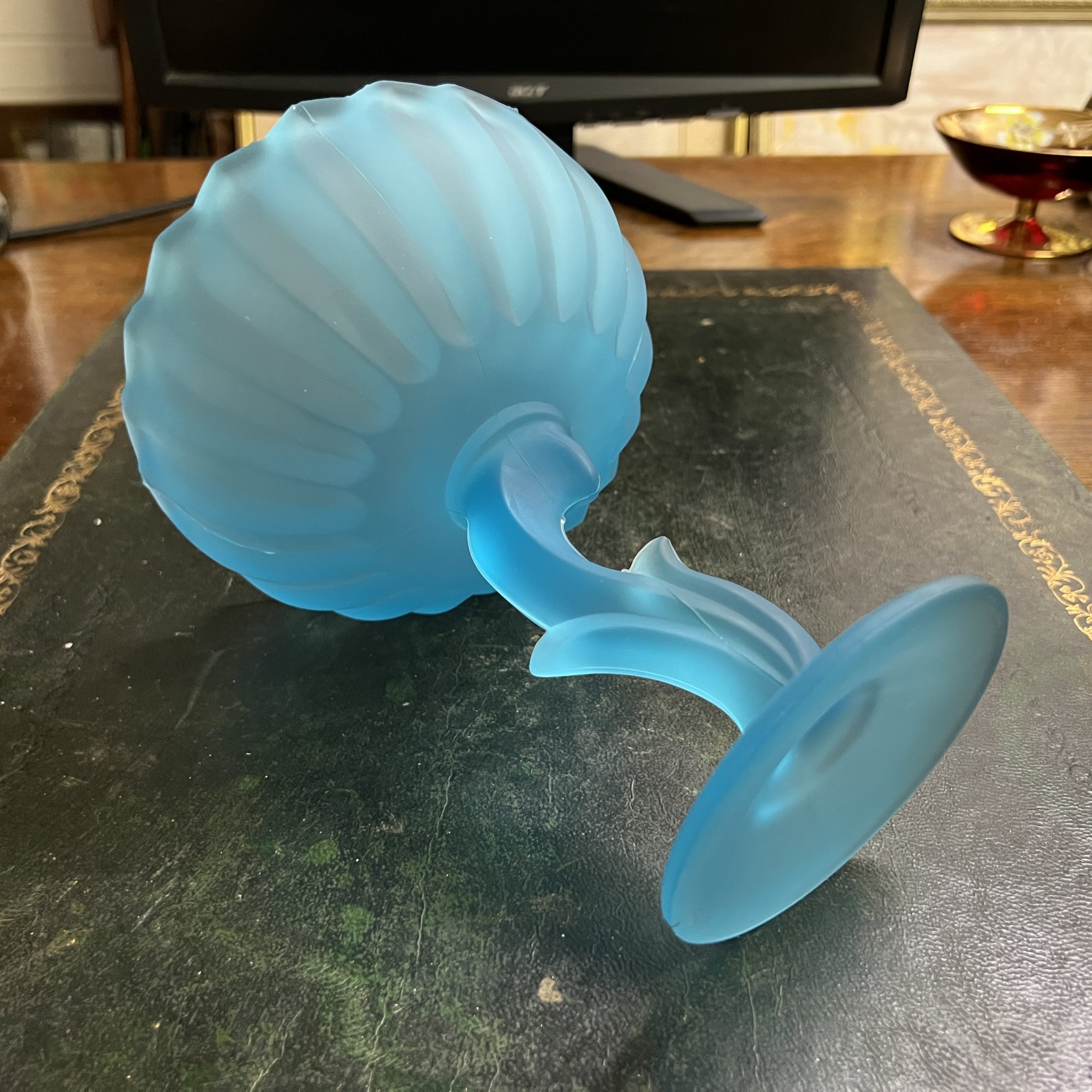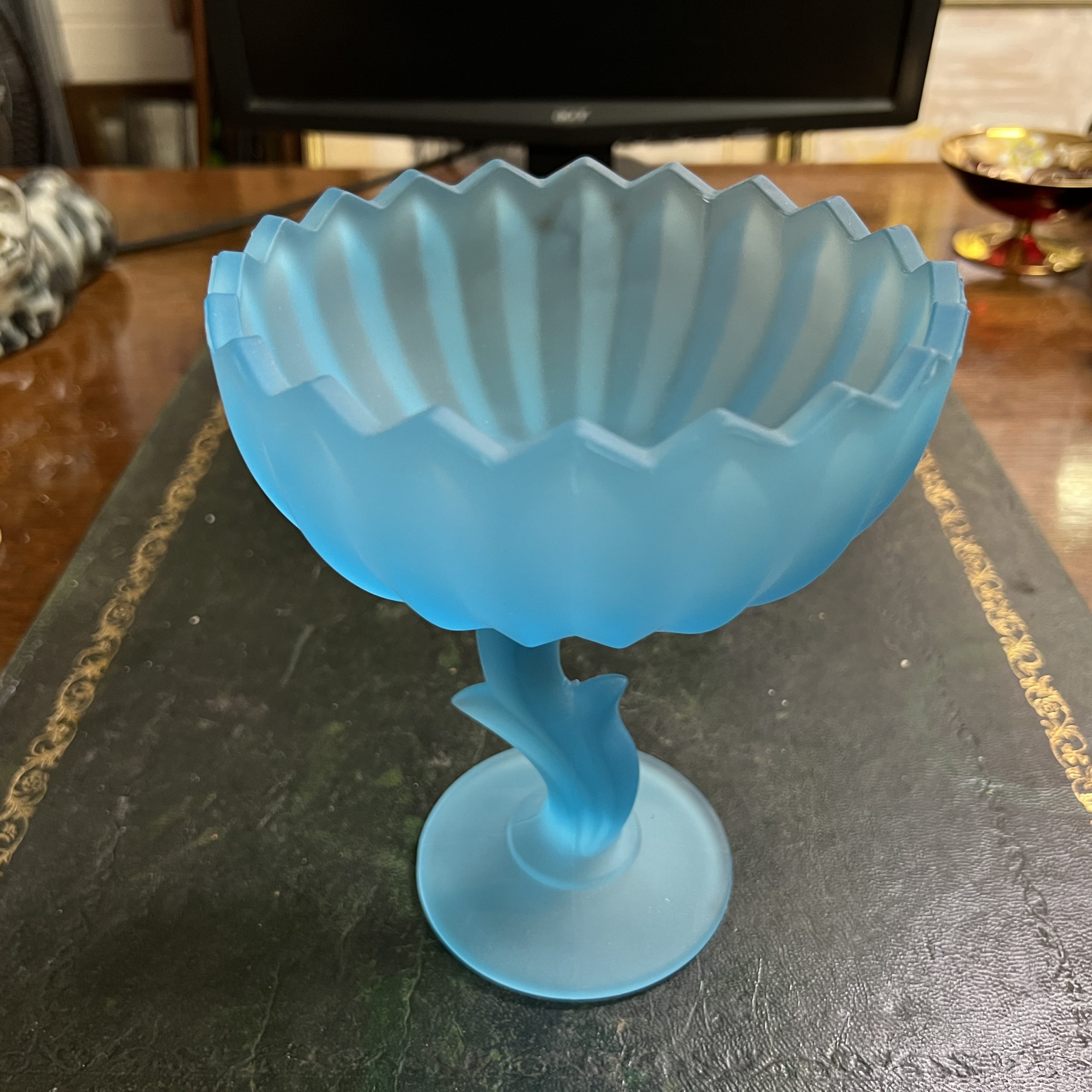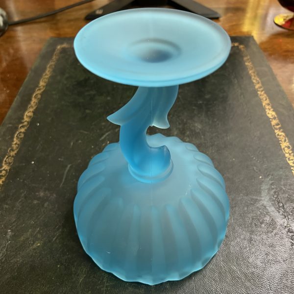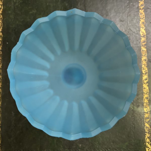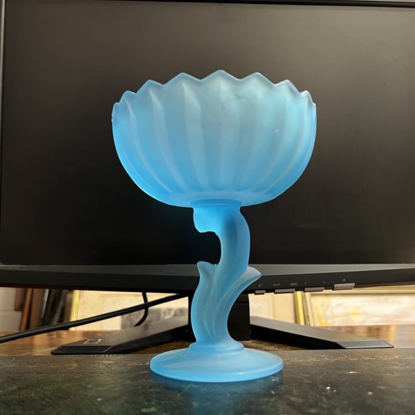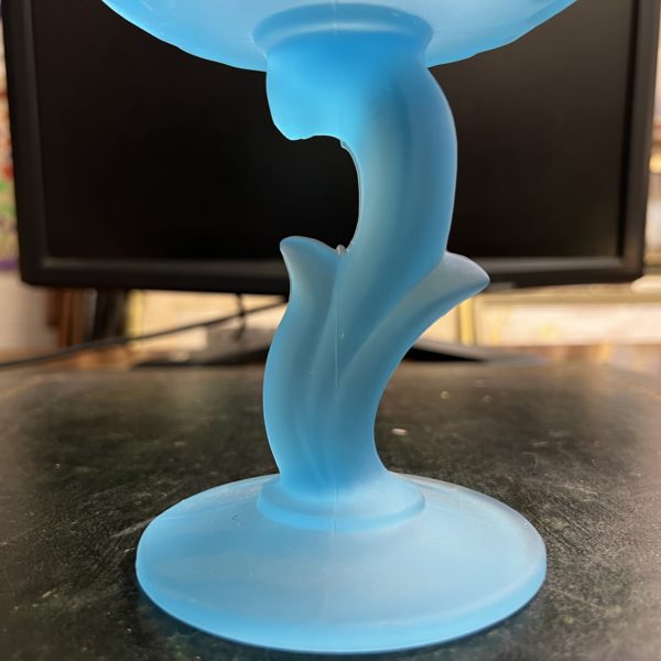 Art Deco blue satin glass long stem raised flower form bowl