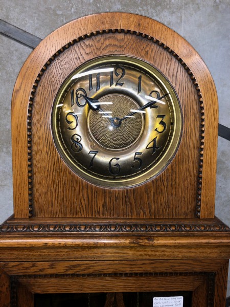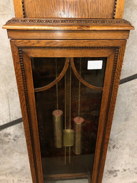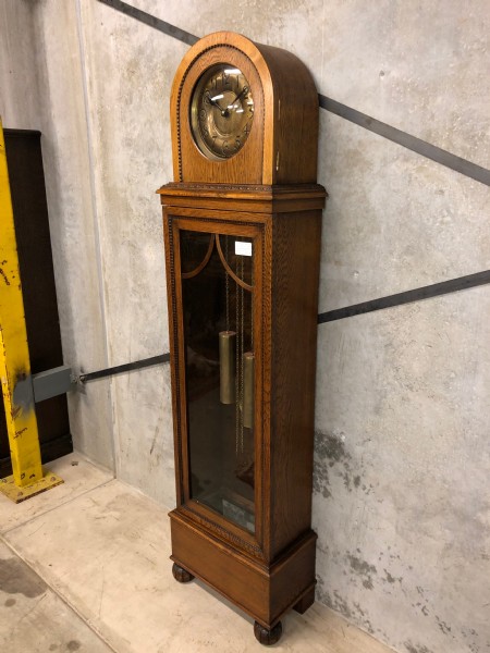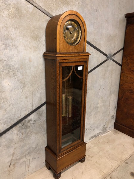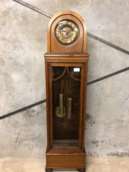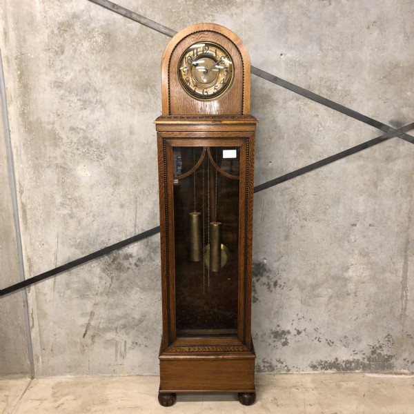 Art Deco long cased clock with an eight day weight driven movement that chimes on the half hour and hour, it has a gold dial with black Arabic numeral and hands.